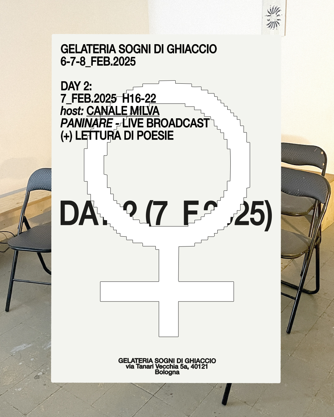 Paninare è un progetto itinerante di CANALE MILVA dedicato alla poesia e all’arte radiofonica. Orchestrato da Giada Olivotto e Camilla Paolino Questa prima tappa, in collaborazione con GSG e Allison Grimaldi Donahue (special guest), vedrà la lettura delle poesie di vinit agarwal, Davide La Montagna, Yuna Leonis, Lorenzo Mari, Vipera, Federico Muzzu, Caterina Profico, Mikel Marini e altrə ancora. Le letture saranno accompagnate dalla degustazione di un panino speciale ideato dall’artista Yimei Zhang e saranno trasmesse live su CANALE MILVA.