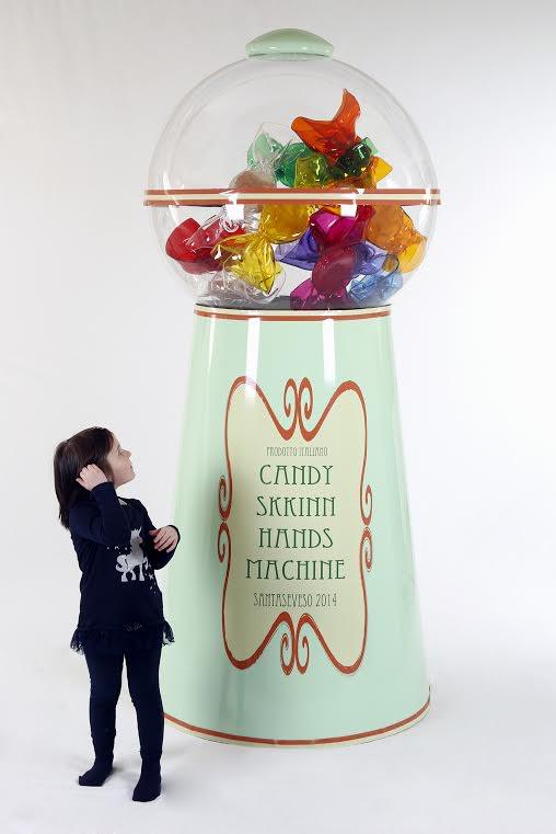 CANDY SKKINNHANDS, LECCA LECCA SKKINNFEETS, e via enumerando le opere, precedute da “Prodotto Italiano” e seguite da “SANTASEVESO 2014”, queste etichette dai colori dolciastri riecheggianti iscrizioni anni Venti e Trenta made in U.S.A., nei caratteri e nelle giustezze loro, si completano con la ricetta, cioè si accompagnano, come ogni buon prodotto alimentare o quello che ne fa le veci, all’elenco degli ingredienti, e del peso che, a loro modo, imitano ingannevolmente alla vista. Benché siano stati realizzati in materiali estranei, anzi meglio: alieni. Dal momento che sono stati confezionati in una scala più grande del vero con materie avveniristiche che sono, principalmente, derivati chimico-industriali del petrolio. Quanto alla ricetta, essa è corredata dal suo inevitabile codice a barre, necessario per il mercato (per la messa in vendita del prodotto). Il tutto redatto in colori antichi: verde scuro, verde acqua, arancione, giallino. Cromie che sfuggono alla tirannia newtoniana dei colori primari e concorrono a riecheggiare vecchie confezioni paragonabili, in qualche modo, alla “madlene” proustiana, il biscotto dei ricordi. confezioni – anni Cinquanta-Sessanta – di “Biscotti Mellin” e“Biscotti al Plasmon”. L’infanzia, in altre parole. I suoi sapori e i suoi odori, le visioni indimenticabili e sognanti.