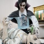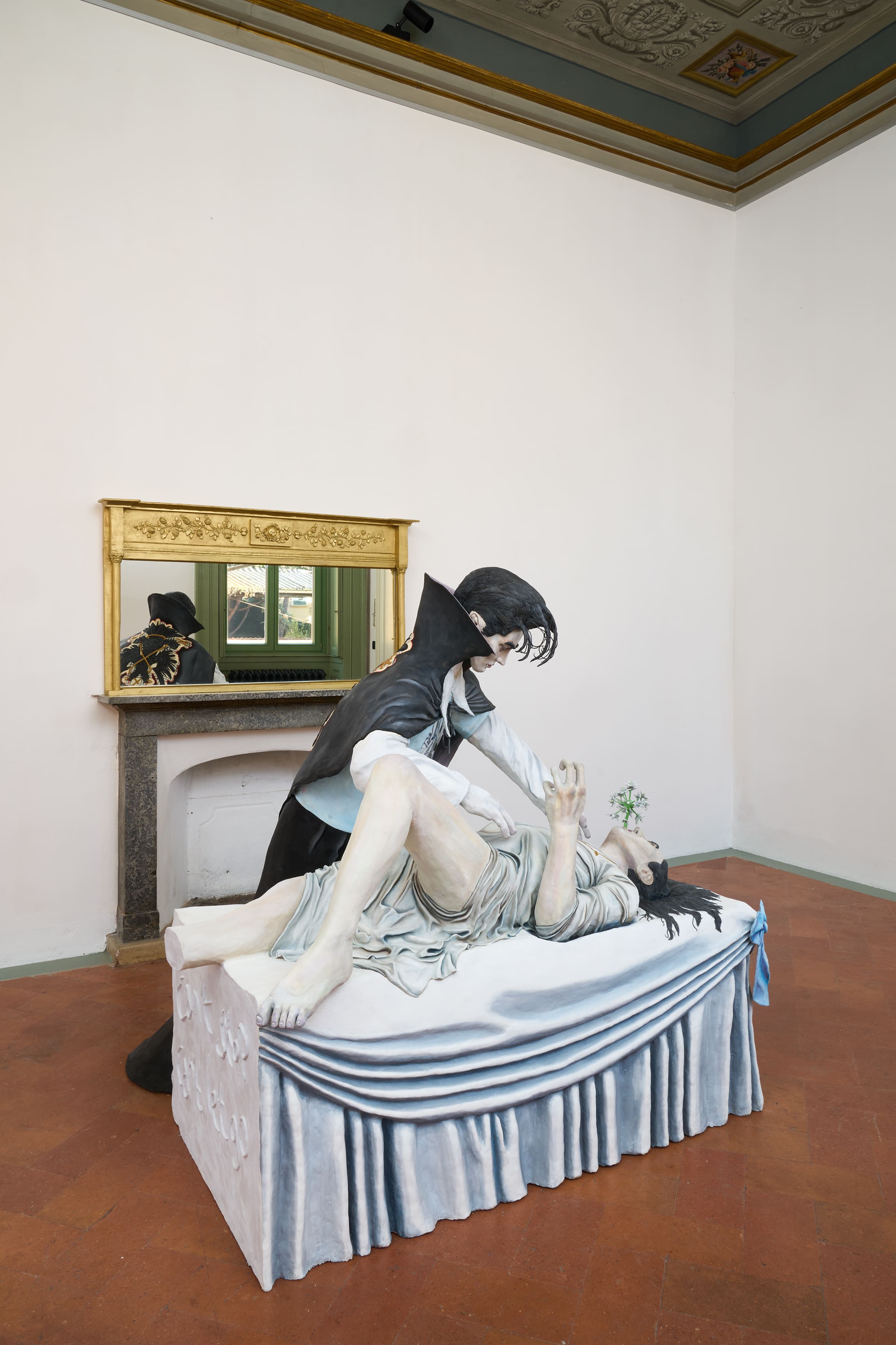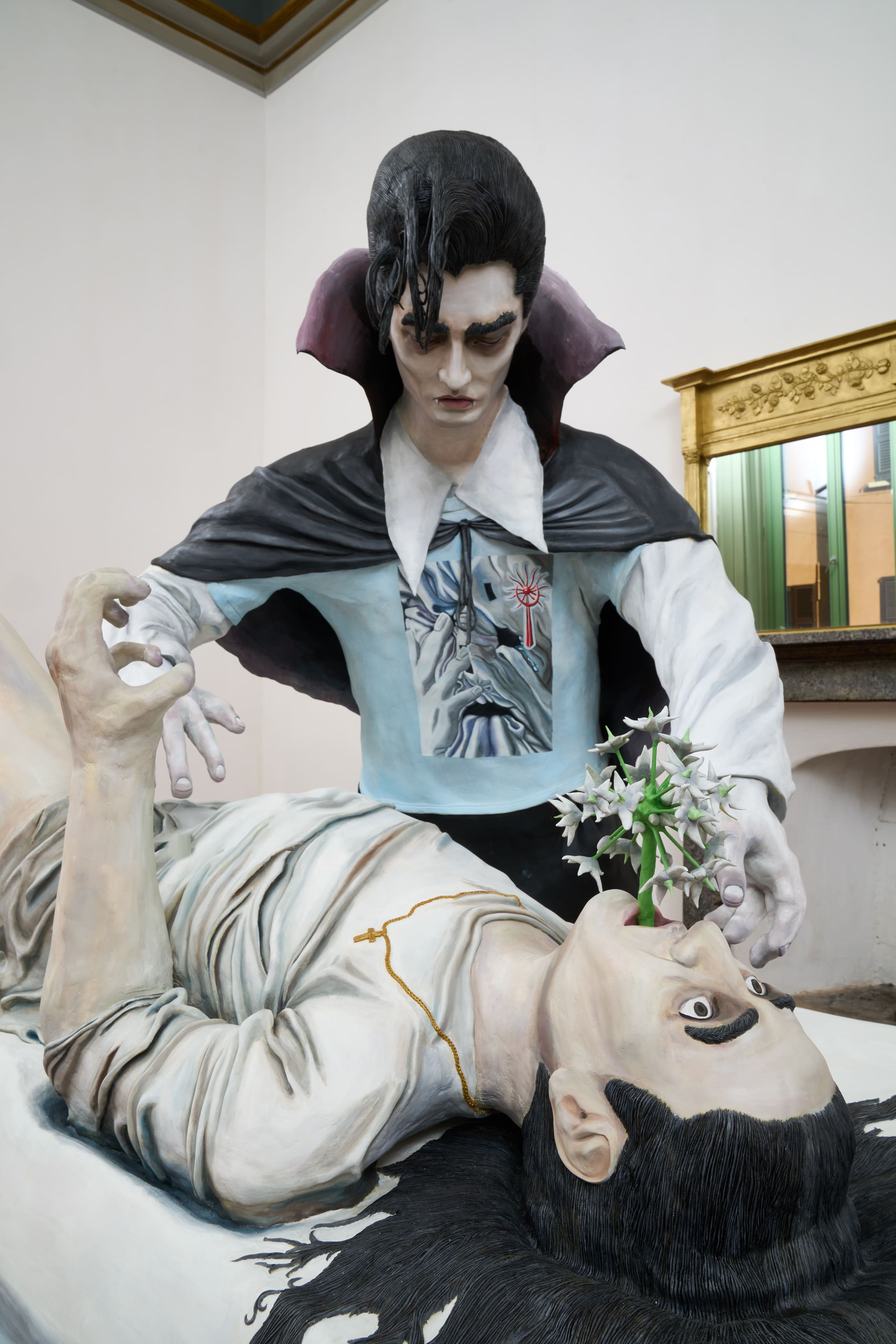 Gli abiti non sono quelli di un vampiro tradizionale: la maglietta indossata sopra ad una camicia e la grafica stampata vengono solitamente associate alle culture adolescenziali. Questo colloca il vampiro in un lasso di tempo più contemporaneo, invece di trovarsi all’in- terno di un’ambientazione ottocentesca, come le figure presenti in Dracula di Bram Stoker (1897) o Il Vampiro di John William Polidori (1819), o successive iterazioni gotiche nella letteratura e nella cultura popolare, come indicato dal mantello. La t-shirt lo collega tuttavia più strettamente con i vampiri adolescenti più contemporanei, come nella Twilight Saga (2008-2012), Vampire Diaries (2009-2017) o Buffy L’ammazza-vampiri (1993-2007). Queste due forme culturali si fondono nell’opera, attraverso riferimenti nell’uso del tessuto increspato delle lenzuola e degli indumenti di sculture classiche, pensiamo a Bernini o Raffaello, e la posa formale che ricorda Gesù e Maria.