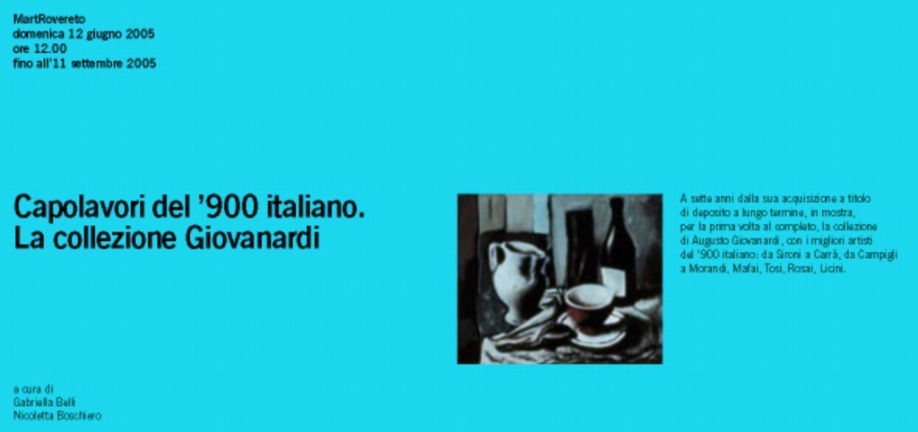 A partire dal 24 maggio il Mart mostrerà - per la prima volta nella sua interezza – la Collezione Giovanardi, da sei anni presente al museo come deposito a lungo termine. Un doveroso omaggio al grande collezionista Augusto Giovanardi, giunto felicemente al traguardo del centesimo anno di vita, che ha riunito i nomi del miglior Novecento italiano: Mario Sironi, Carlo Carrà, Osvaldo Licini, Massimo Campigli, Filippo De Pisis e Giorgio Morandi, ma anche autori di minor fortuna critica come Rosai, Semeghini, Mafai e Tosi. Il catalogo, edito da Nicolodi e curato da Gabriella Belli e Nicoletta Boschiero ripropone, debitamente aggiornati, i testi dell’edizione 1998.