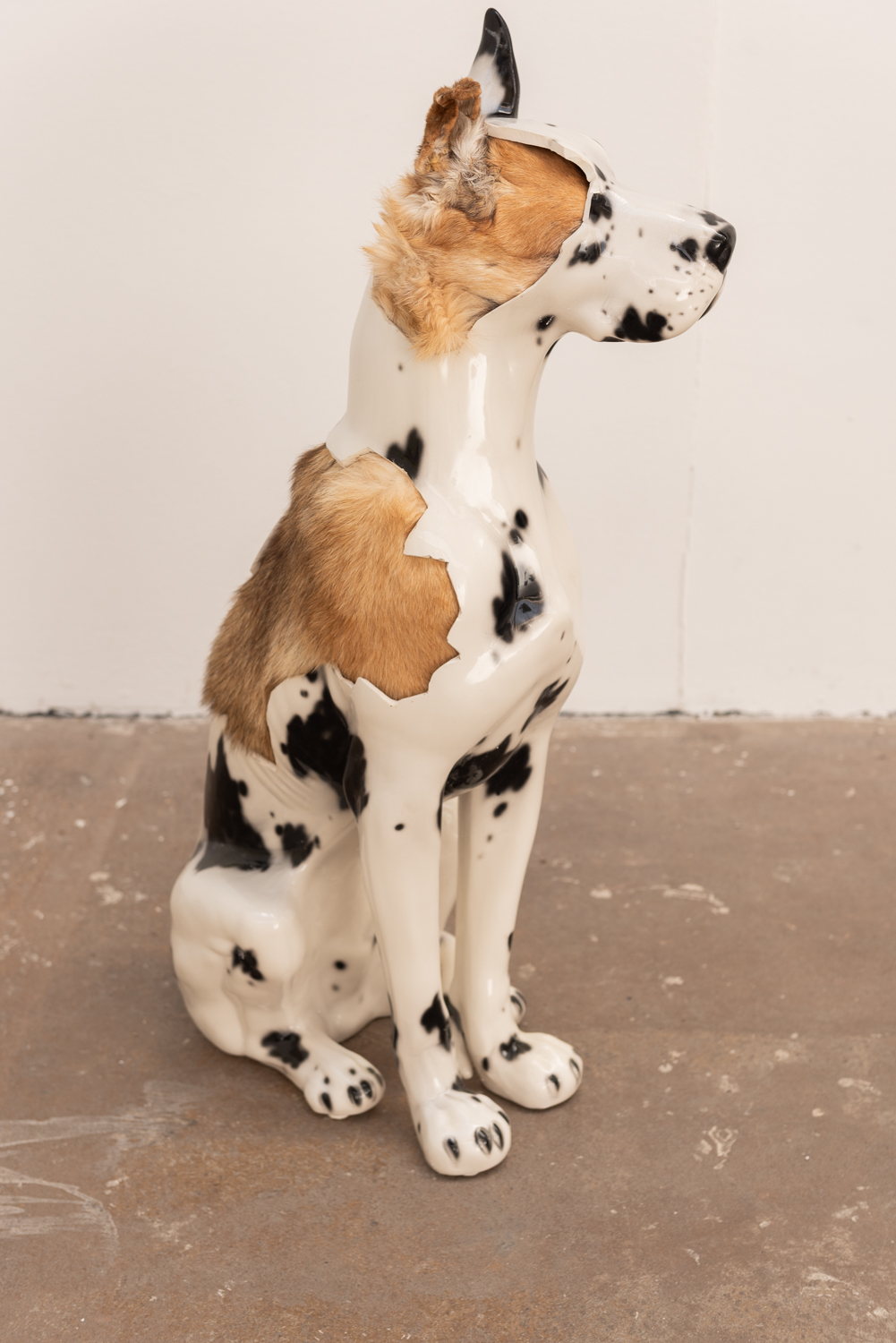 Il genuino trionfo oltre la facciata si riflette nella porcellana tassidermica Donatella, 2024, un alano tedesco, razza storicamente associata all’aristocrazia e alta borghesia teutonica. In riferimento al prestigioso turismo della Capri anni 60’, l’opera pone l’accento sull’oggettivazione dell’animale in quanto status symbol.
