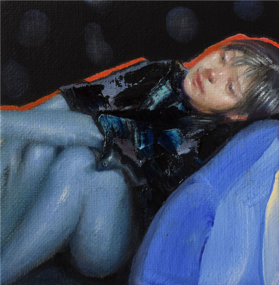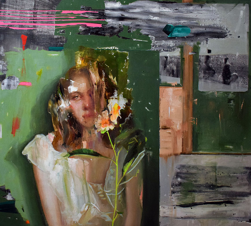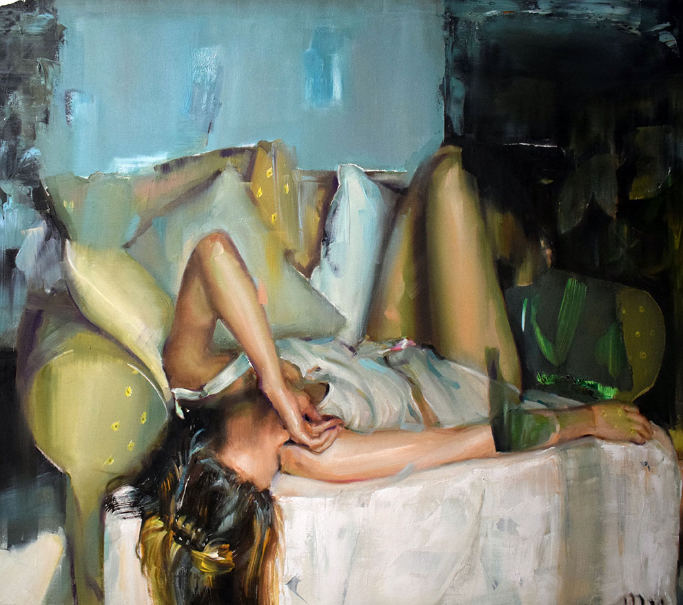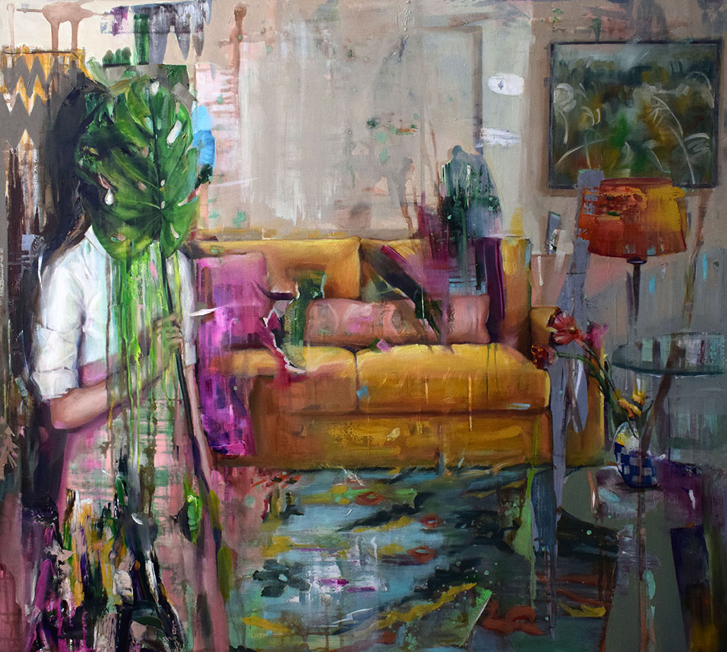 Ispirandosi ai selfies presenti nei social network, l’artista dipinge figure femminili immerse in ambienti domestici servendosi della pittura ad olio su tela misto lino, segnando così un punto di svolta nella sua pratica artistica, precedentemente incentrata sull’uso dell’acrilico.