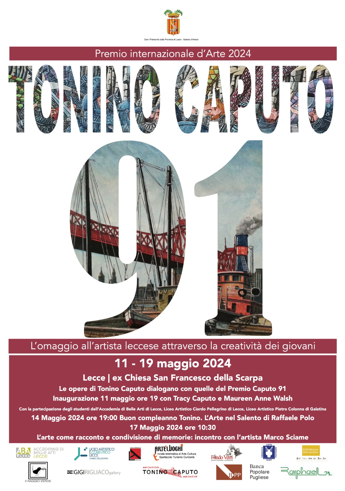 Dopo gli omaggi realizzati negli ultimi due anni, in occasione del 91 esimo compleanno dell’artista Tonino Caputo (Lecce 14 maggio 1933 - 5 agosto 2021) prende il via la manifestazione Caputo 91 il Premio Internazionale d’Arte organizzato dalla casa editrice Il Raggio Verde in collaborazione con l’Archivio “Tonino Caputo”, l’associazione culturale “Fondo Verri” la rivista telematica “Arte e Luoghi” , Gigi Rigliaco Gallery con il sostegno di Banca Popolare Pugliese, Bar Raphael e associazione culturale “Messapia Arte”.