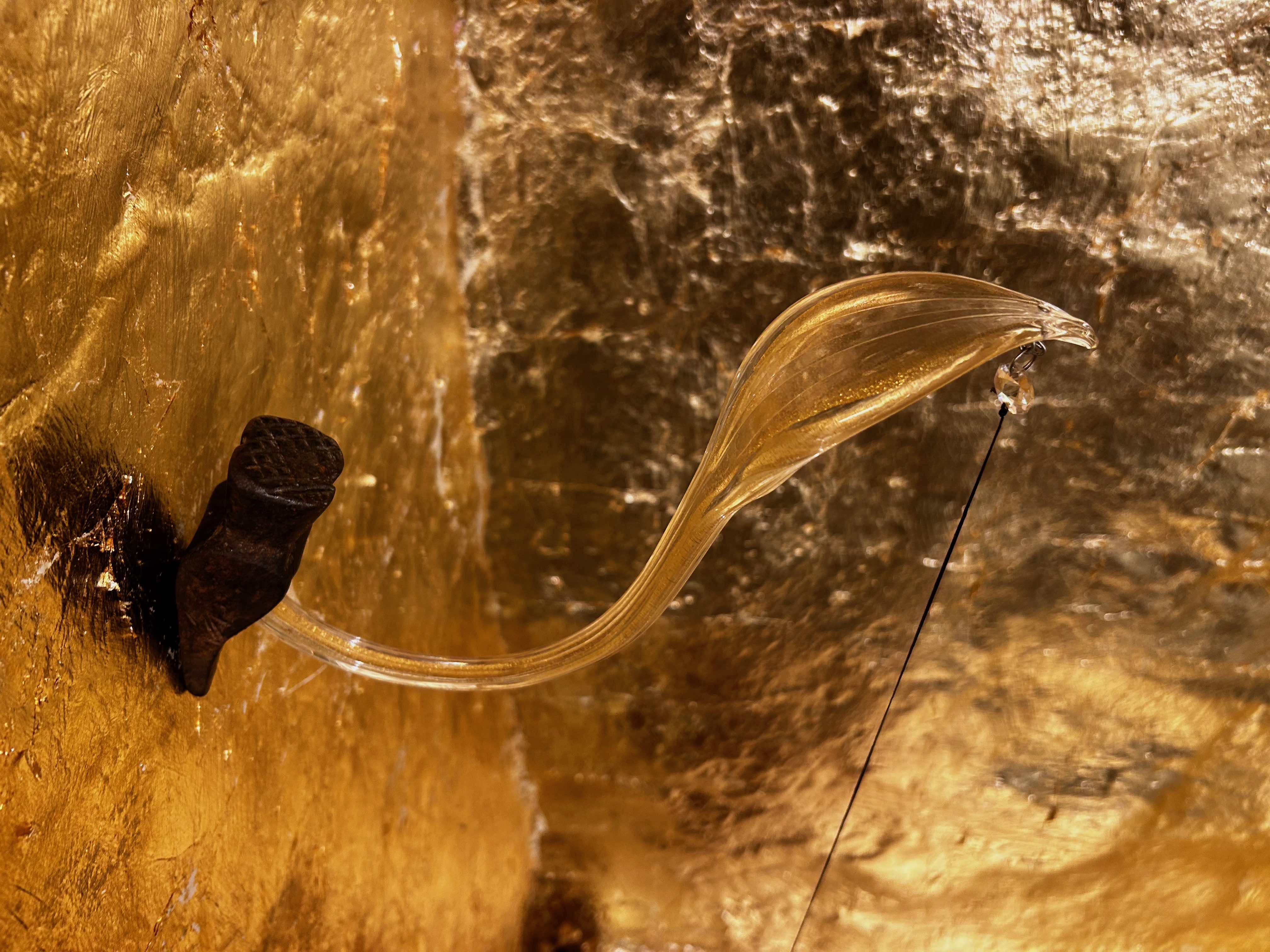 Il post-moderno sancisce la ‘fine delle grandi narrazioni’. Ma c’è un popolo esiguo che ancora crede alla bontà dei secoli, alla forza del rito, al carattere quasi leggendario di una visione, alla potenza di un’immagine che parla. Carla Barchini sa di appartenere a questo popolo. Non ha paura di perdersi nel dedalo di strade ricche di significati che si intrecciano nella sua poetica, anzi, riesce a risolverli con una soluzione stilistica coerente che diventa la nuova via del suo pellegrinaggio. Materiali nobili come l’oro o vetri di Boemia e Murano incontrano la povertà di alcuni legni o ferri industriali, si depositano e si elevano a materia animata da un calore misterioso. Il ventre magmatico e sotterraneo dello spazio, informato anche da opere site specific, rivela quindi la metafora della fiamma che è luce e punto di fusione: abbandono del corpo, catarsi, nuova pelle. La pelle stessa è regione che l’artista esplora nel suo vocabolario di segni, una cartografia della superficie che nasconde tracce della sfida originaria che accompagna l’uomo, la natura e tutto l’universo di simboli che l’autrice ricerca silenziosamente. Il Dragone è la presenza benevola con la quale dialoga, la sua fiamma, le sue scaglie impenetrabili; una narrazione leggendaria incontra il sentimento personale di Barchini, tocca la sua storia e la sua carriera artistica, informa la propria idea di contemporaneità.