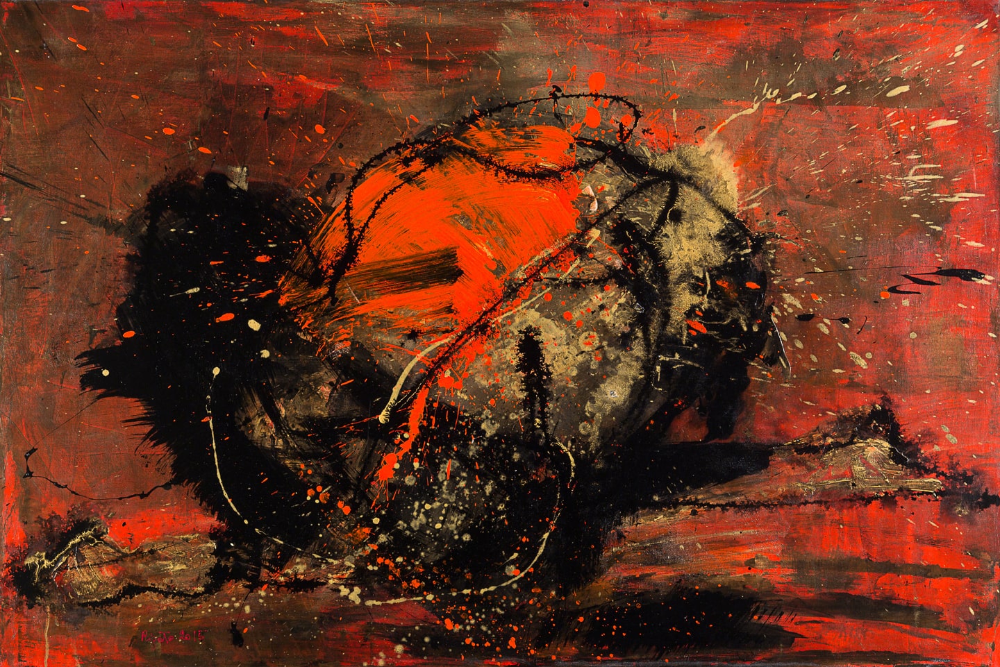composizione sta in bilico tra astrazione e cenni di figurativo, mentre la materia pittorica,
