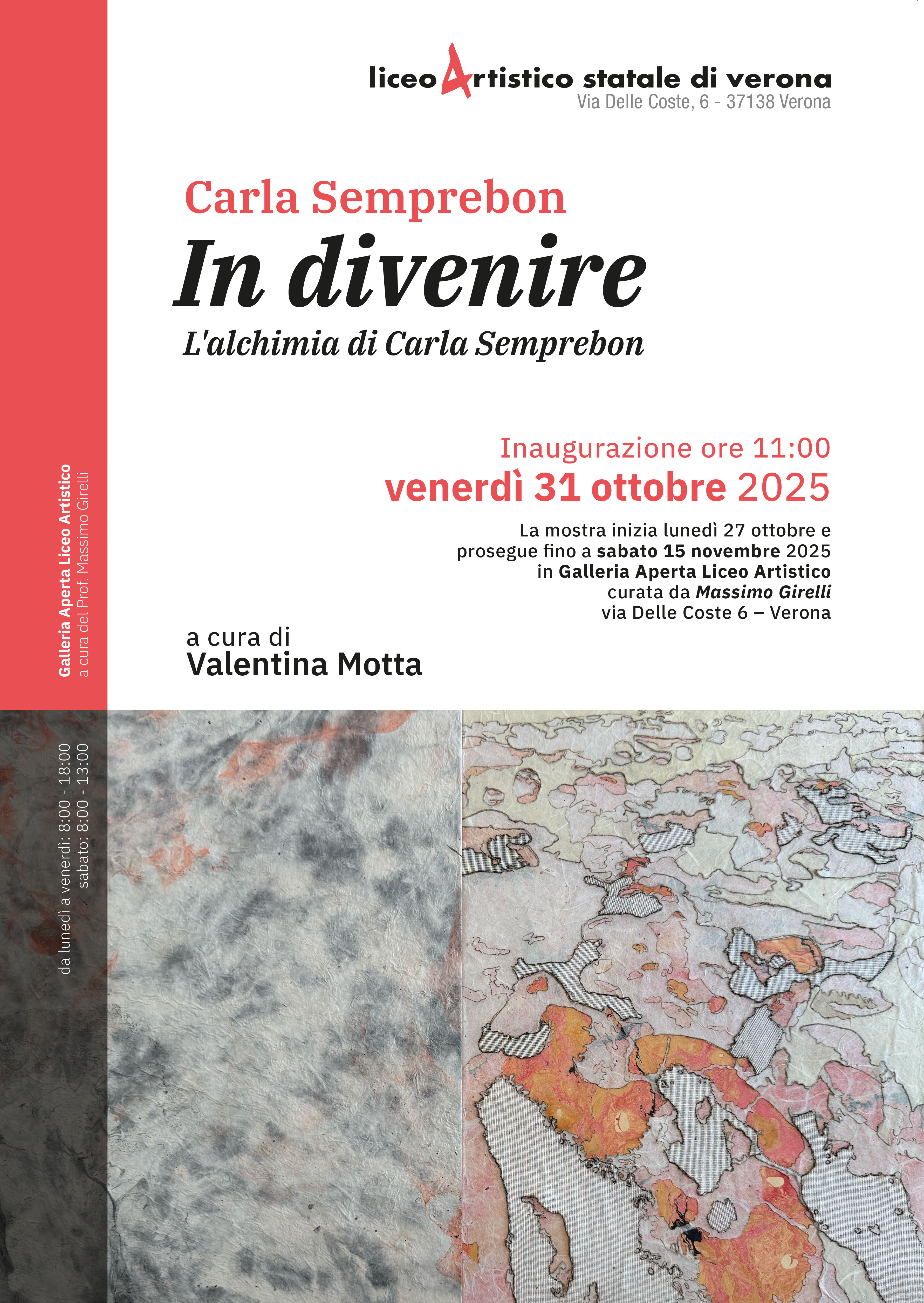 La mostra "In divenire", allestita presso la Galleria Aperta Liceo Artistico Statale di Verona, presenta una selezione di stampe e dipinti che testimoniano la poliedricità del linguaggio visivo di Carla Semprebon. Ogni opera esposta è una tappa di un percorso che si rinnova continuamente, in cui il gesto artistico si fa apertura e possibilità.