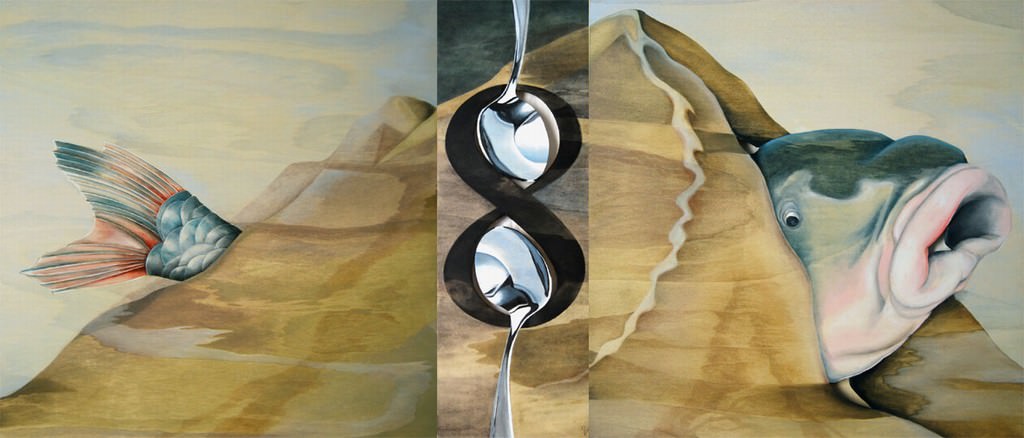 Dice l’artista: “ L’inghiotto come l’omega di una nascita e la risorgenza come l’alfa di una resurrezione”. Il continuo rincorrersi delle lettere α (alfa) e Ω (omega) aggancia il fenomeno a una dimensione metafisica, al ciclo continuo di inizio e fine proprio di ogni vita, un percorso potente quanto sfuggente a ipotesi e calcoli troppo definiti.