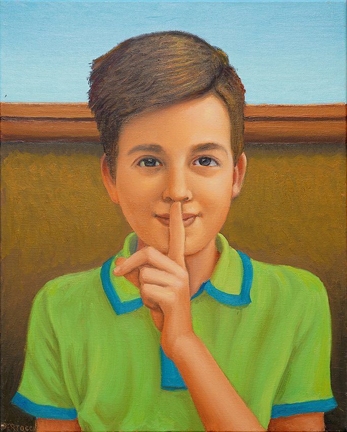 Le figure nei dipinti di Carlo Bertocci, uno dei protagonisti Toscani del ritorno alla pittura figurativa in Italia negli anni 80ta, hanno una grande attrazione comunicativa. Non raccontano una storia o citano un avvenimento, ma la loro presenza si sente, tramite lo sguardo, tramite i gesti, ciò rende le sue opere aperte a diverse interpretazioni. Nelle opere in mostra è proprio il gesto, dito indice di fronte alle labbra chiuse, che invita al silenzio il protagonista della prima parte della mostra sia nei dipinti del maestro che nelle fotografie di Pupi e Schillaci che dialogano tra di loro.