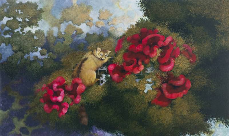 Ventidue dipinti inediti, frutto di un’approfondita ricerca che, attraverso il progressivo recupero di paesaggi ideali, giunge ad immagini oniriche e surreali, dominate da una vegetazione rigogliosa e abitate da creature funzionali alla dimensione visionaria.