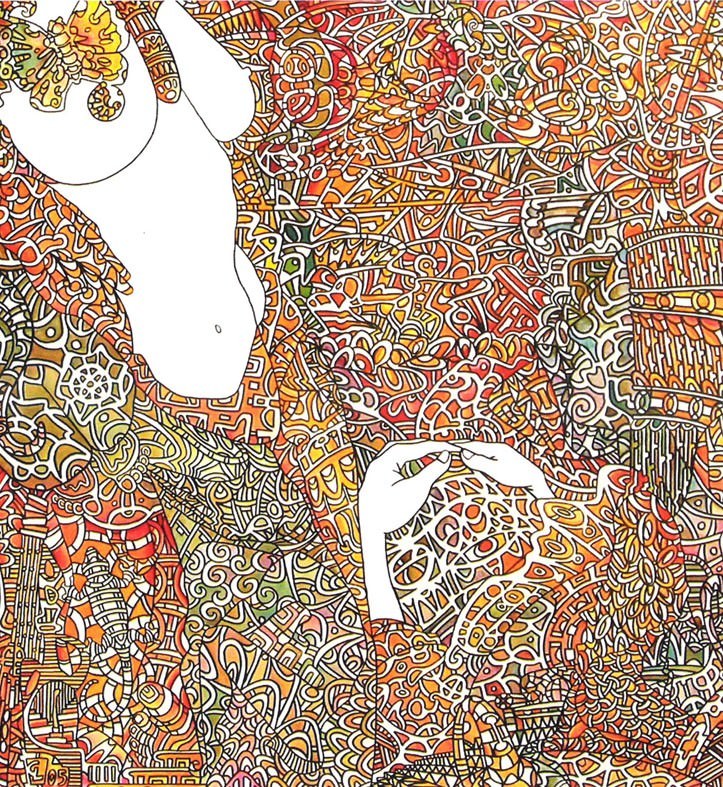 Il disegno guida l’occhio alla ricerca di richiami e punti fissi, nell’illusoria impresa di una piena contemplazione. È un perenne scrutare che insegue le linee sinuose e taglienti che tutto assorbono e tutto rigettano.