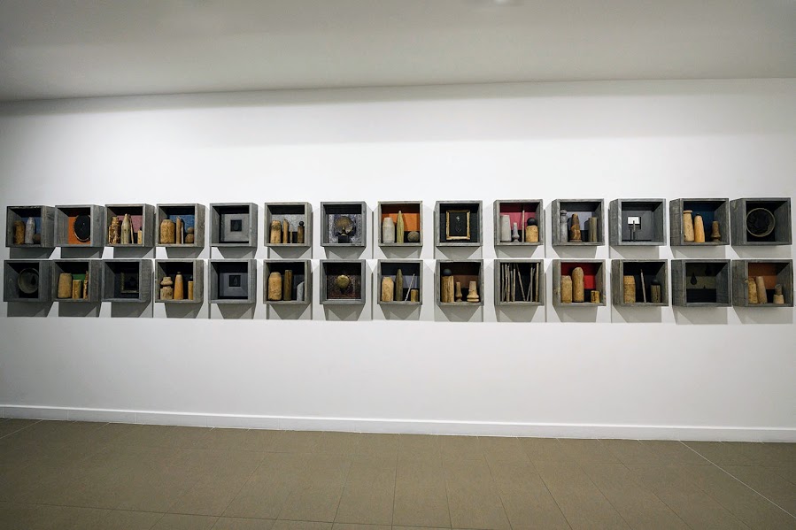 La memoria non conserva una copia esatta della realtà, ma l'interpretazione che il soggetto ne dà, modificabile nel presente. (S.Freud) . Volgiamoci ora alla grande opera con sfondo nero in tessuto e 10 cornici vuote, che Marchetti affianca e presenta in mostra. Un'opera dal forte carattere concettuale, interpretabile come una riflessione sull'assenza, la memoria o il potenziale inespresso. La combinazione di elementi neri (spesso associati a mistero o vuoto) e cornici vuote (che solitamente indicano un soggetto mancante) crea un contrasto che invita alla contemplazione. L'opera mette in discussione il ruolo della cornice. Invece di valorizzare un'immagine, la cornice stessa diventa il soggetto, evidenziando il "nulla" o il nero del tessuto, spostando l'attenzione dall'oggetto al concetto.