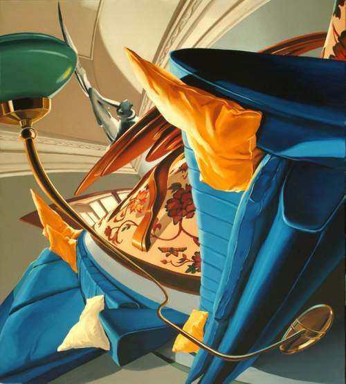 Up down ovvero sottosopra, immagini distorte deformate esasperate, scorci di interni di situazioni che dominano le tele esposte.