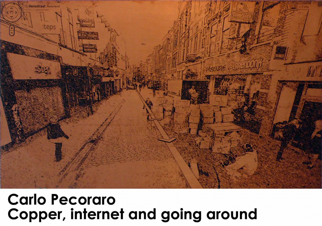 Con la sensazione di vedersi riflessi su uno specchio, ci si trova inconsciamente spronati a controllare i propri spostamenti e a sentirsi parte di un unico gioco con le immagini. Va delineandosi la natura camaleontica dei due mezzi espressivi: la facciata del televisore evoca la superficie levigata e riflettente del rame e mentre il video sembra prendere la forma di una lastra in movimento le lastre somigliano più a delle istantanee del video. Dinnanzi a esse il tempo si arresta, lo spettatore non è persuaso ad assorbire con impellenza le immagini, ma a meditare più su di esse.