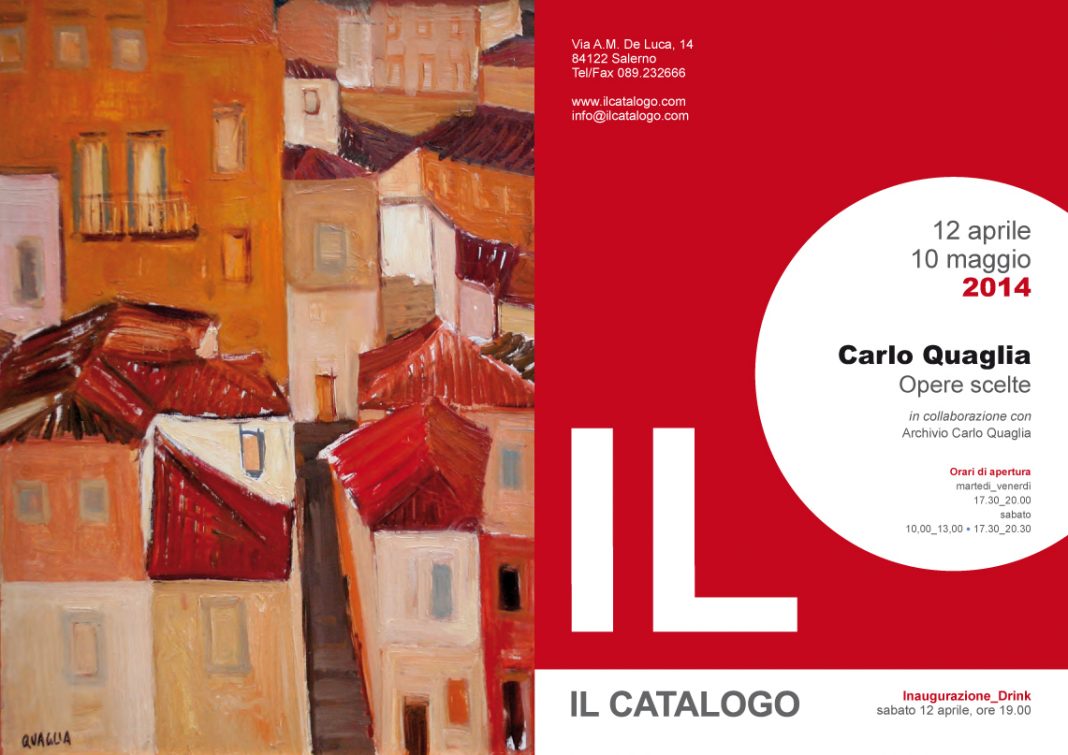 La galleria salernitana Il Catalogo di Lelio Schiavone e Antonio Adiletta in collaborazione con Archivio Carlo Quaglia, con il il nuovo appuntamento della sua stagione espositiva, pone lo sguardo sul pittore ternano Carlo Quaglia, il cui segno si ricollega alla significativa esperienza della Scuola Romana. La mostra, circa 30 opere tra olii e disegni, è un compendio dello stile e dei temi prediletti dall'artista, quali paesaggi capitolini e marine. Quaglia mette in luce, così, alcune calde e brucianti memorie della città d’adozione, Roma, con il suo barocchismo dei monumenti, alle quali si uniscono vedute del litorale ligure che rendono incline la tavolozza dell’artista verso la pennellata larga, dove il colore gli si diffonde raffinato e vibrante.