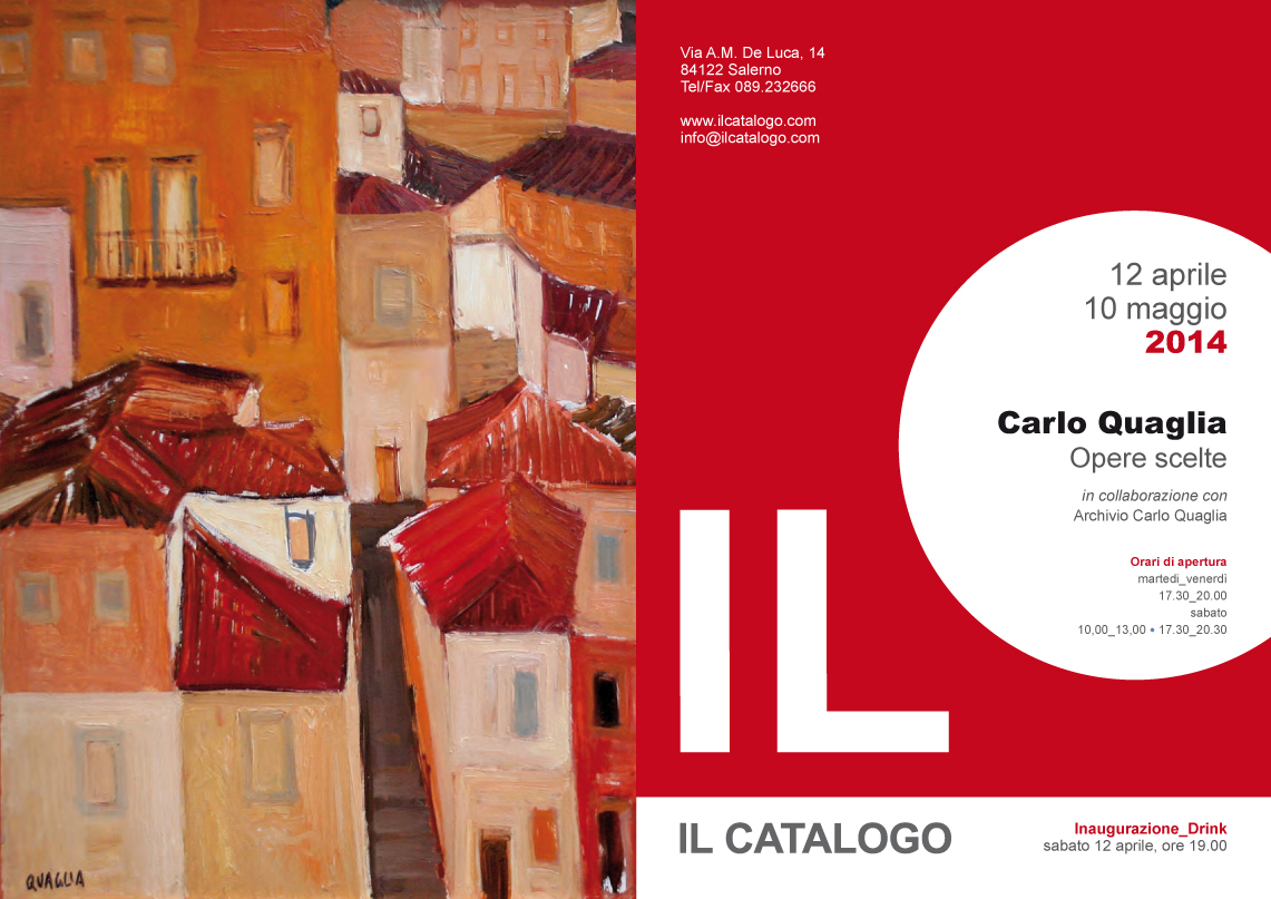Il Catalogo e Le Opere Scelte di Carlo Quaglia in collaborazione con Archivio Carlo Quaglia. La galleria di Lelio Schiavone e Antonio Adiletta a Salerno , via A.M. De Luca, 14 inaugurerà sabato 12 aprile 2014 alle ore 19,00 l'esposizione di circa 30 opere, tra olii e disegni, del pittore-violinista ternano e sarà aperta al pubblico fino a sabato 10 maggio 2014.