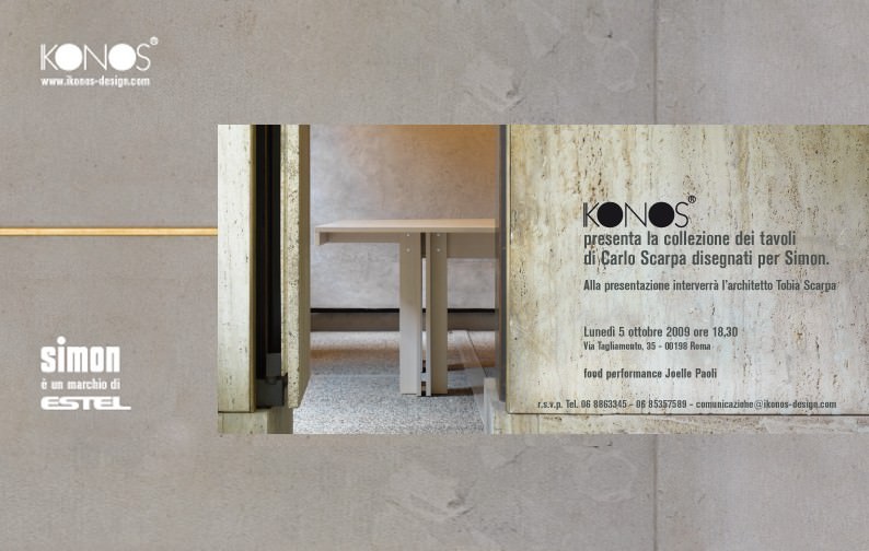 Si tratta di una rievocazione storica di Carlo Scarpa, legati ai progetti di design (in particolare i tavoli) che ha realizzato per SIMON. Scarpa, approcciandosi al design in tarda età, non ha avuto modo di collaborare con molte aziende e la maggior parte dei prodotti è stata appunto commissionata da Dino Gavina per la collezione SIMON. Interverranno come relatori alla serata, il figlio l’architetto Tobia Scarpa, l’arch. Guido Pietropoli, allievo di Carlo Scarpa, Alceo Serafini, product manager di SIMON e Massimo Stella (vice presidente Estel).