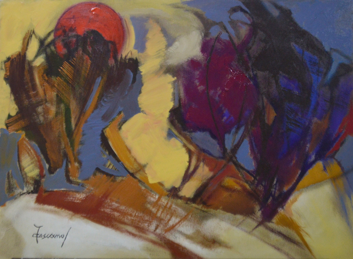 Il nucleo di dipinti su tela esposti rivela una sintetica, ma esaustiva, panoramica di un doppio decennio – anni Settanta e Ottanta – di impegno nell’orbita dell’arte di questo nome appartato e ingiustamente misconosciuto dell’arte in Terra d’Otranto, nonostante gli esiti felici del suo lavoro. C’è un carattere intellettuale che pervade l’esperienza nell’arte di Toscano, mediata soprattutto quando è il paesaggio – probabilmente l’ambito di maggiore interesse nella sua ampia e variegata produzione – al centro del suo pensiero, rivelando consapevolezza rispetto a certe esperienze delle avanguardie artistiche del Novecento.
