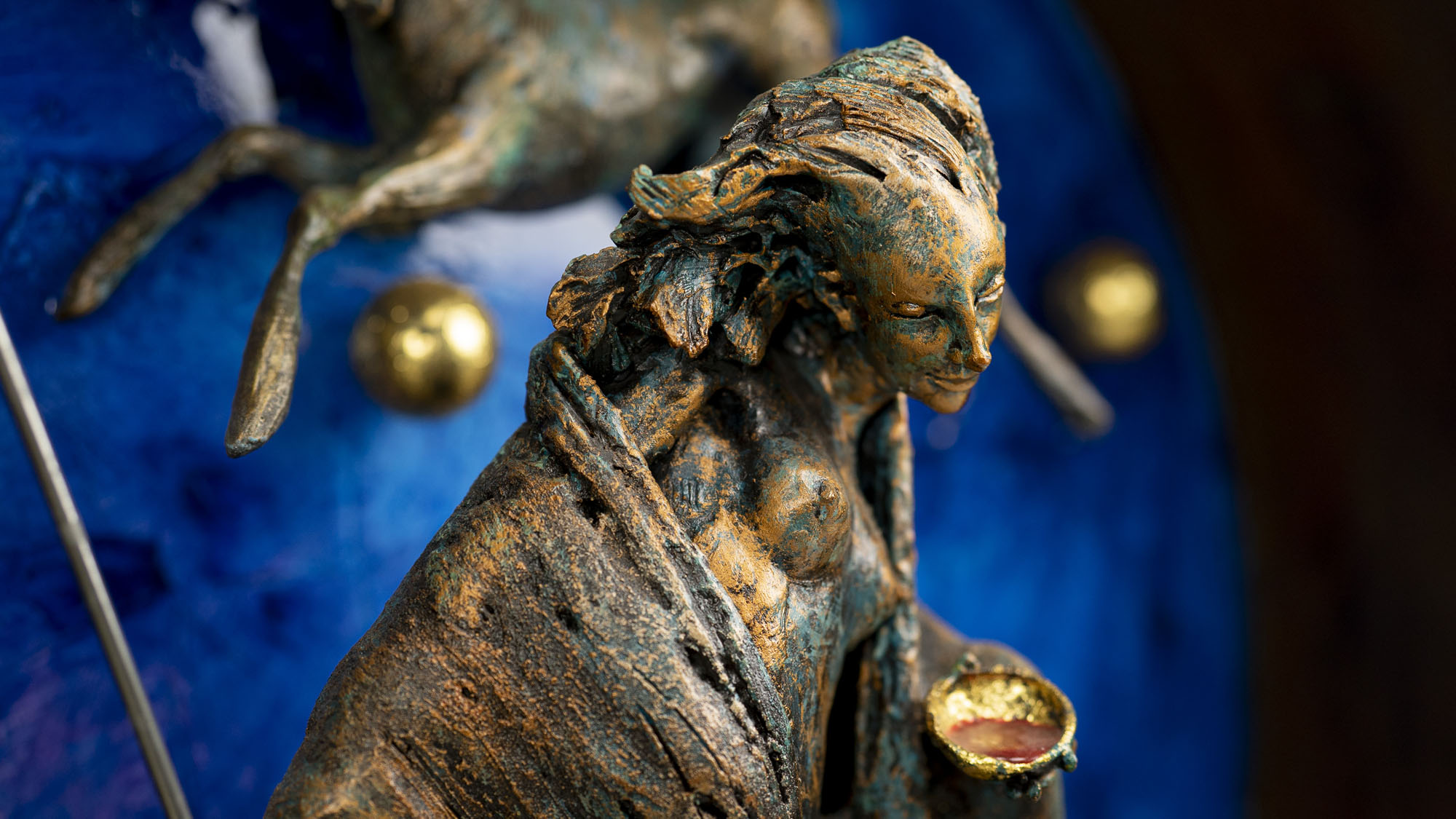 L’Angelo ribelle (2021), ad esempio, diviene emblema di tracotanza, la stessa che Dante cita immerso nella palude Stige accompagnato da Virgilio: “Questa lor tracotanza non è nova.” Un angelo, inscritto in un cerchio, viene colto in un urlo strozzato, privo della capacità di volare perché le sue ali si sono spezzate nel tentativo di avvicinarsi al sole. La fiamma del desiderio di ciò che è proibito lo ha spinto incautamente a travalicare le regole, mettendo in discussione l’ordine prestabilito, e lo ha portato quindi a cadere. Il manifestarsi dell’esistenza è invece rappresentato ne Il sangue vitale (2023) dove la protagonista, forse una maga o forse una sciamana, emerge dal profondo blu dell’universo e porta in dono la linfa vitale, quel seme che proviene dalle stelle, genitrici degli elementi primari da cui ha avuto origine il tutto, i pianeti, la nostra terra, la natura, gli esseri umani, e che continuamente e incessantemente si rigenera.