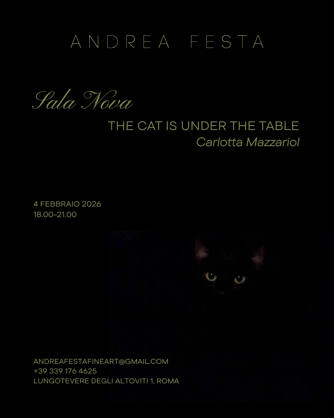 Andrea Festa è lieta di presentare The Cat is Under the Table in Sala Nova, mostra personale di Carlotta Mazzariol. L’opening si terrà il 4 febbraio dalle ore 18 alle 21 e la mostra sarà visitabile fino al 19 marzo 2026.