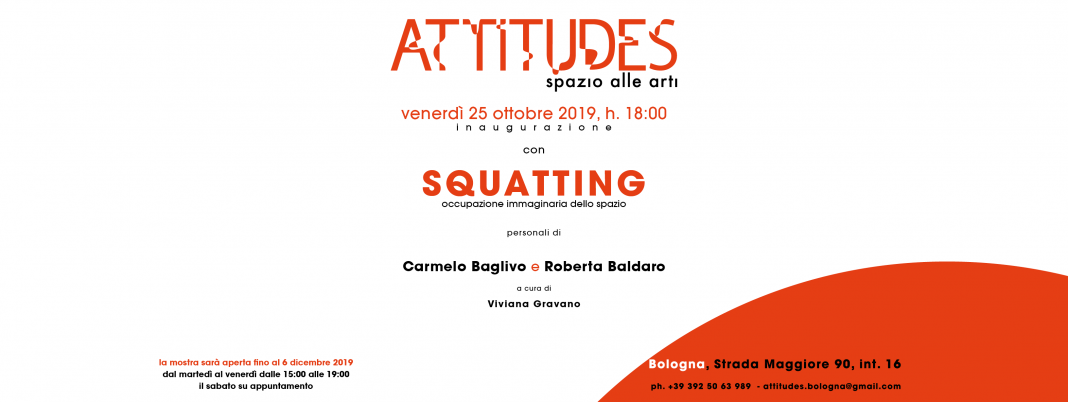 La mostra di apertura di ATTITUDES_spazio alle arti, dal titolo SQUATTING_occupazione immaginaria dello spazio, curata da Viviana Gravano, propone le opere di Carmelo Baglivo e Roberta Baldaro. Ambedue gli artisti lavorano su una immaginifica riappropriazione dello spazio, inteso non come luogo della contemplazione passiva, ma come contesto in cui produrre nuove visioni e traiettorie di "abitabilità" utopica.