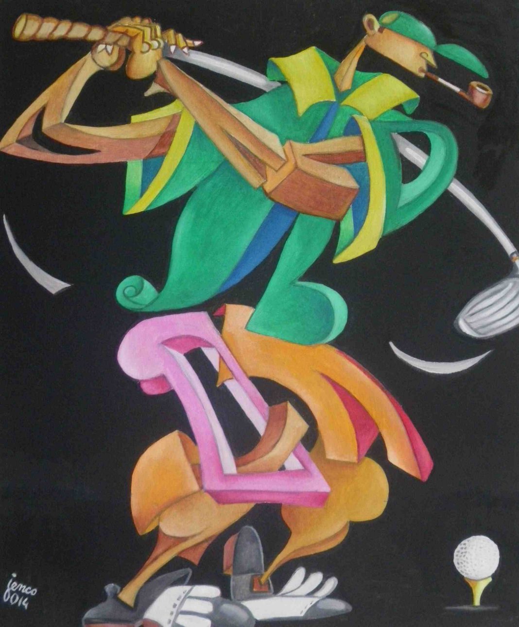Personaggi dello sport, quasi caricature dai colori vivaci e allegri. Carmelo Ienco crea un suo mondo fantastico con anche figure mitologiche e scritte: scene quasi bibliche con lotte medioevali.