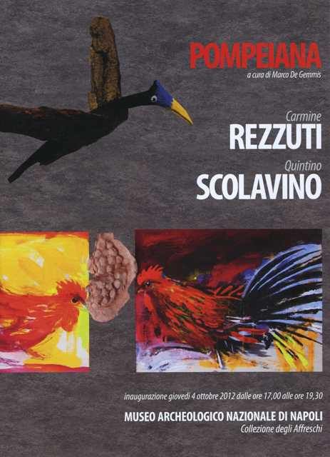 Sembra quasi un paradosso, un continuum spazio-temporale, un’esplorazione ermeneutica o più semplicemente un “viaggio nell’indefinito”, come lo chiama Scolavino, alla ricerca dello svelamento definitivo e agognato dell’essenza delle cose dal sapore Kantiano. Quest’essenza, il noumeno, l’angolo in ombra del fenomeno, vengono così mirabilmente espressi e si traducono, come in un sudato risveglio dal mondo onirico, nelle esplosioni deliranti delle “tavolette” di Scolavino, uno scenario irreale, un Vesuvio che incombe su una società ignara e dormiente e si confonde ai giochi di luce e ai colori dei fuochi d’artificio di un’improbabile festa nell’immaginario collettivo, e nelle librazioni atemporali sulla Villa di Agrippa a Boscotrecase, nei voli, quasi esplorativi di un mondo ignoto, degli uccelli di legno di Rezzuti. Due anime, quelle dei due artisti, che diversamente si intrecciano e si slanciano e si bilanciano, intrudono in una scenografia che può esistere solo nell’arte o nel sogno o in un immergersi ed emergere dalle profondità della storia, implodendo in essa ed esplodendo in quelle che agli occhi dell’osservatore sono “camere segrete”, “macchine per giocare”…