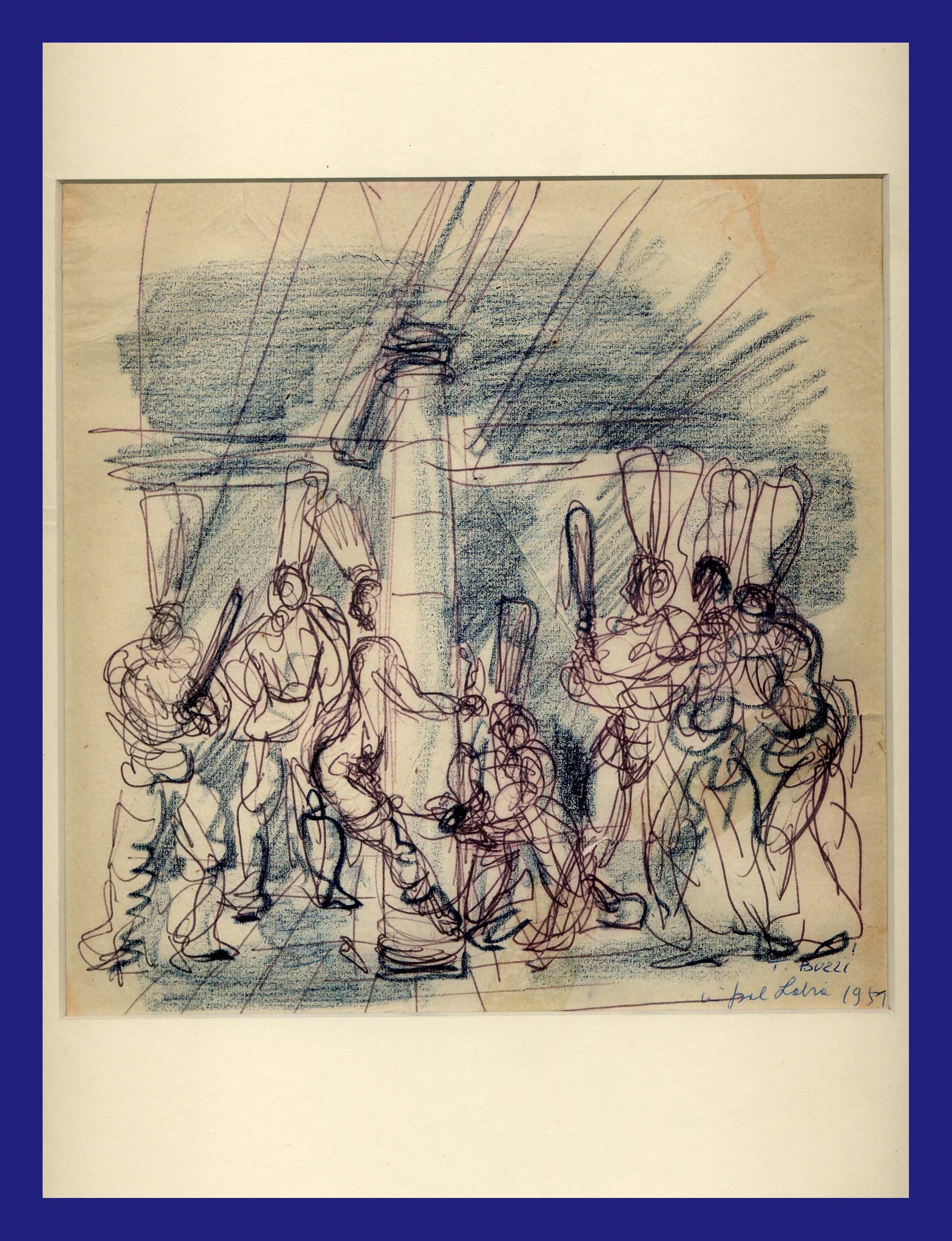 È possibile distinguere all’interno del corpus buzziano dedicato ai “cuochetti” un vasto gruppo elaborato nel 1951 in occasione di una famosa festa a Palazzo Labia a Venezia, evento memorabile – scrive lo storico dell’arte Paolo Campiglio – di cui rimangono anche numerose testimonianze grafiche degli ambienti del palazzo con gli invitati in differenti momenti della serata, da cui l’artista prese ispirazione per inventare schizzi a matita e pastello, o solo a matita, che rievocano il ballo dei cuochi sulle pentole, le schermaglie, la vestizione del cuoco, la “Lustraio nigra” o la matricola del cuoco, il re dei cuochi, il castigo del cuochetto (fustigato come un Cristo alla colonna), con una fantasia inesauribile. Nei disegni appare evidente, come costante, la visione scenografica, quasi da palcoscenico della scena d’invenzione, influenza di un approccio illustrativo.