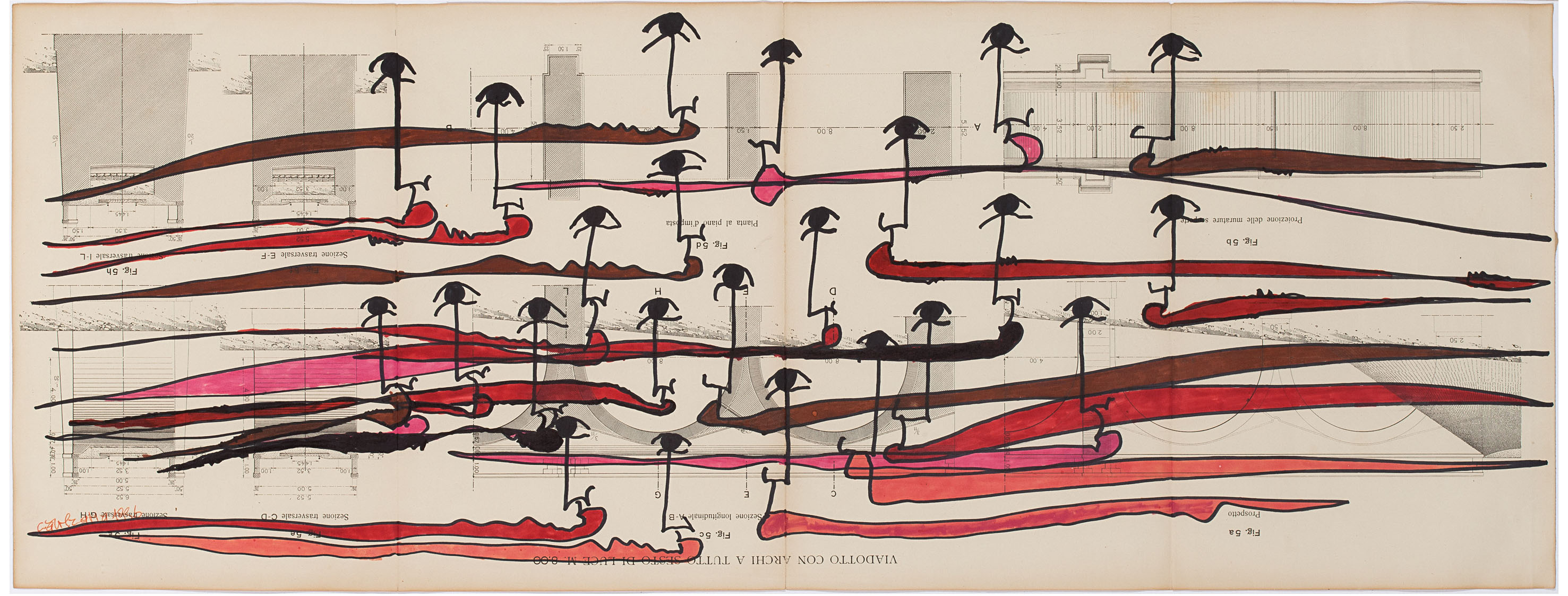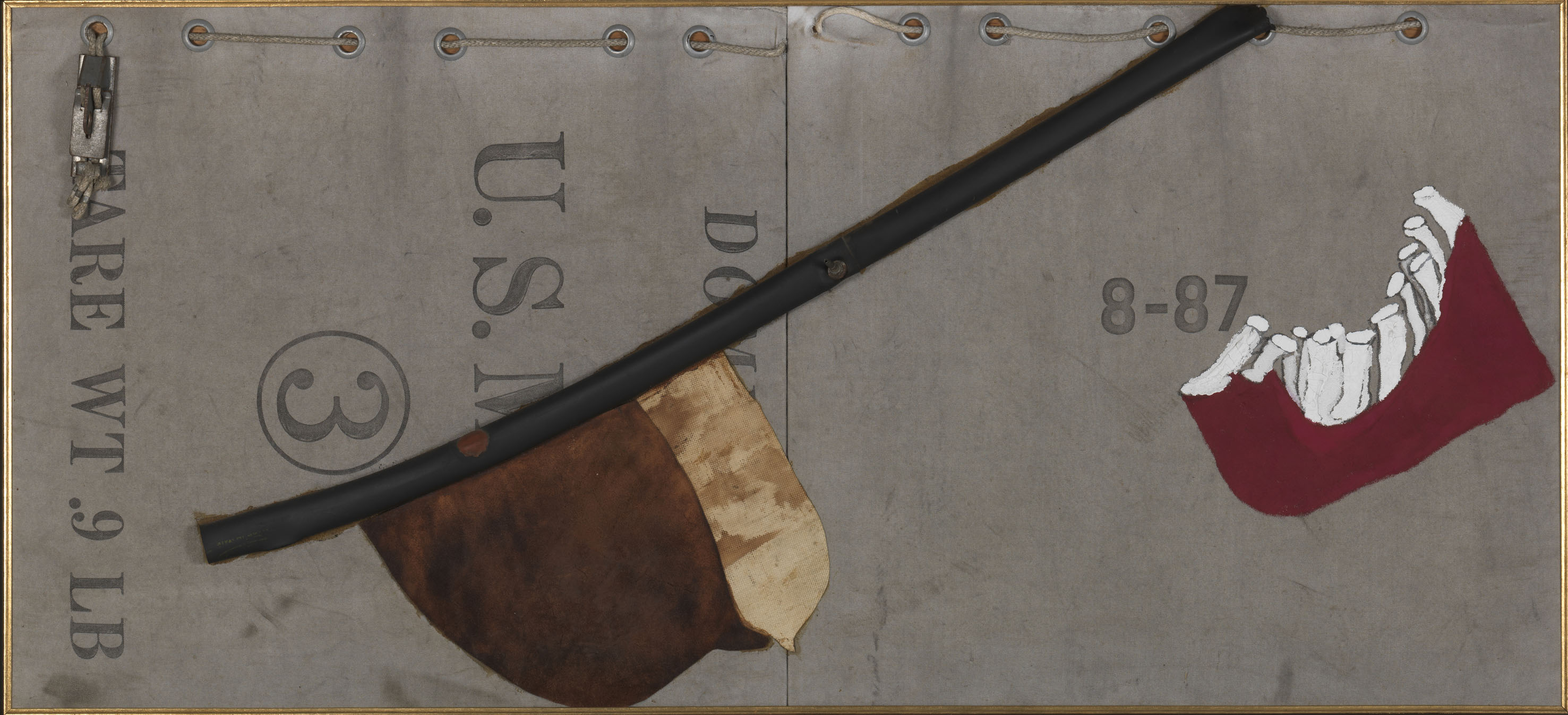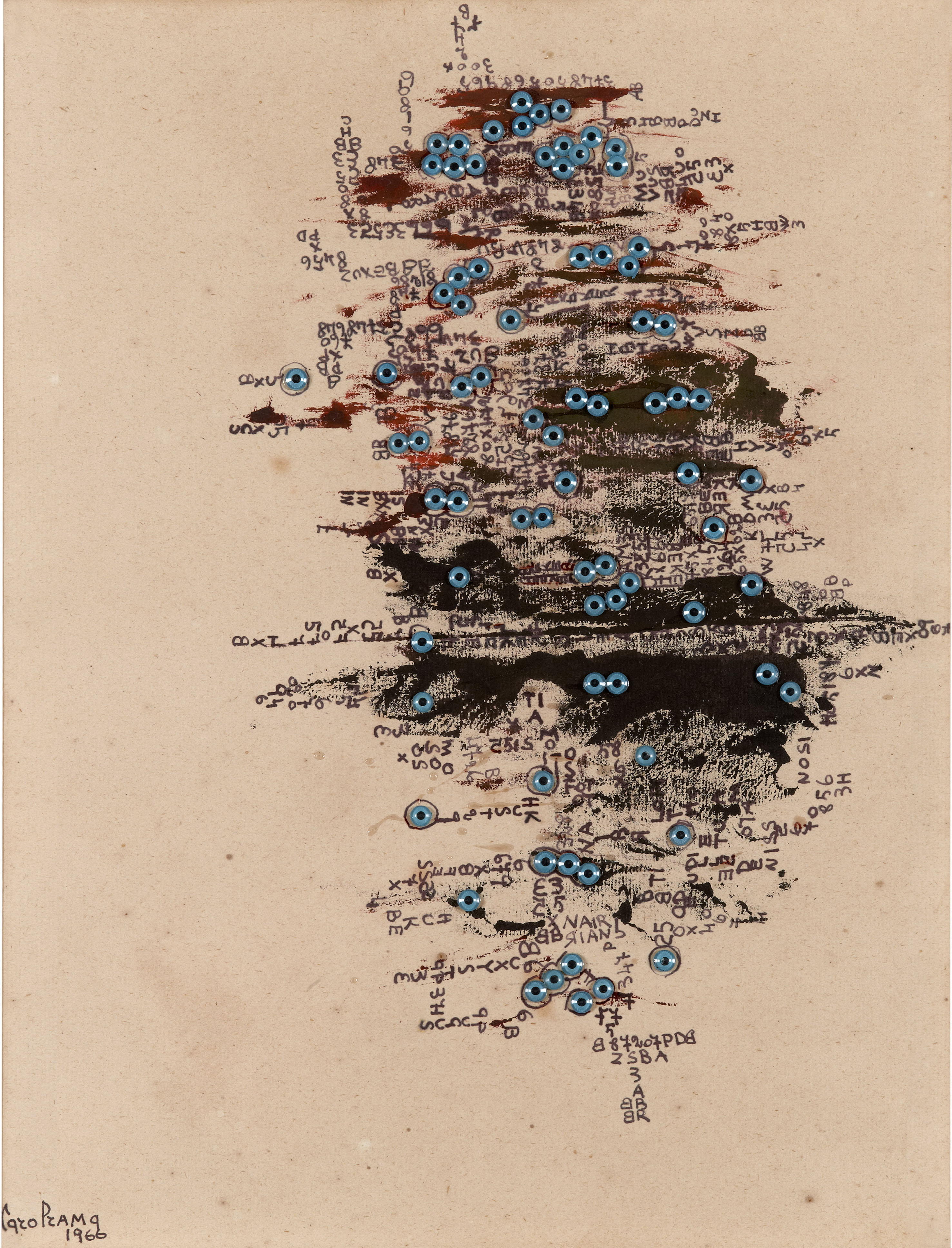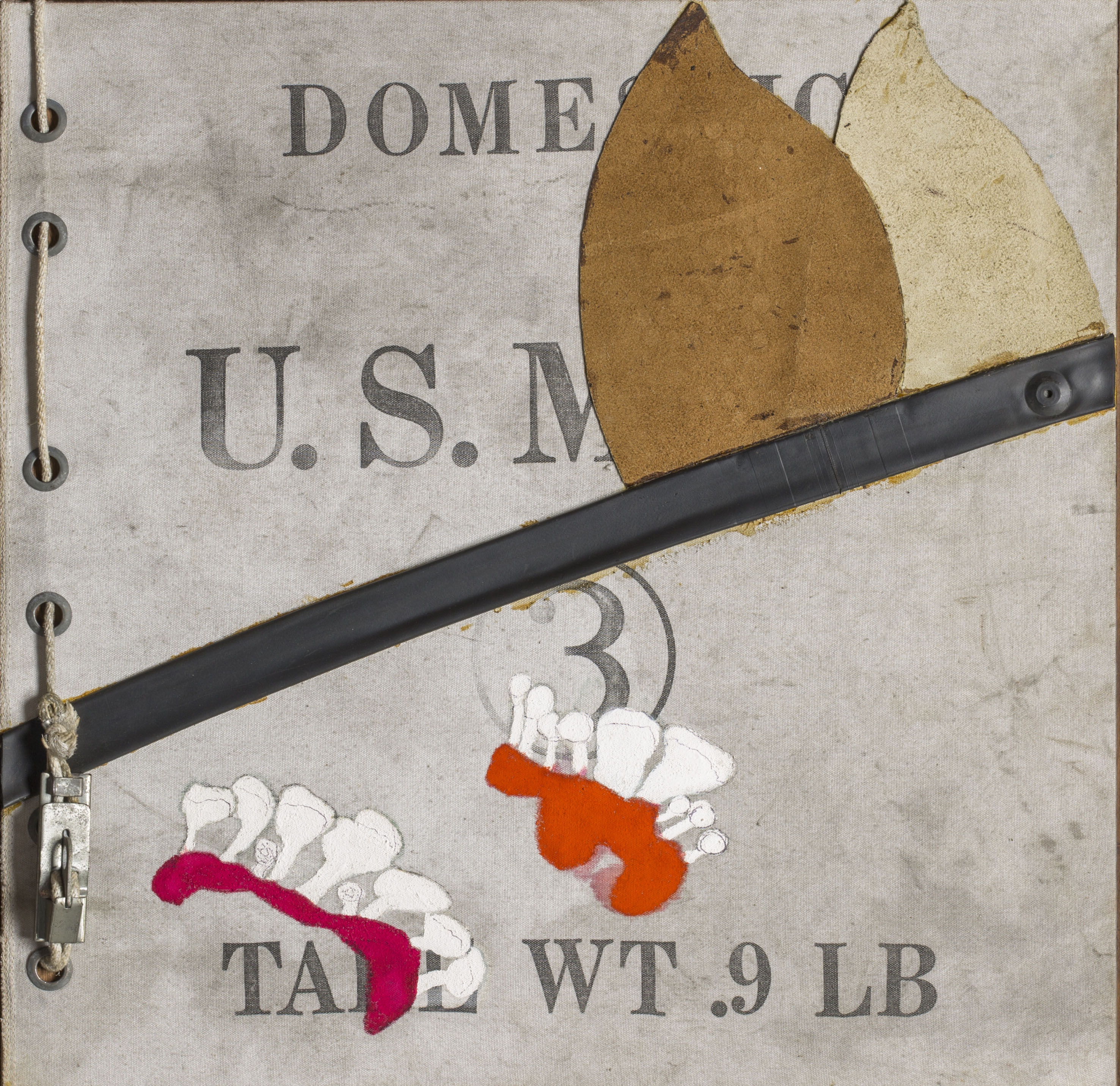 Viene presentata poi la nota serie dei Bricolages (così definiti da Edoardo Sanguineti) prodotta dalla metà degli anni Sessanta: l’approccio pittorico a macchia di derivazione informale è integrato con il collage di oggetti quali occhi di bambola, scarti della lavorazione del metallo, siringhe, pietre, tappi in gomma e molto altro: materiali e oggetti di recupero, carichi di vissuto, che entrano nella composizione del dipinto. Vi sono poi i lavori della fine del decennio Sessanta composti da smalti, vernici nebulizzate e inserzioni di oggetti che, attraverso l’allusione a figure con gli arti protesi e ad ombre atomiche, rimandano alla condizione umana in piena Guerra Fredda.