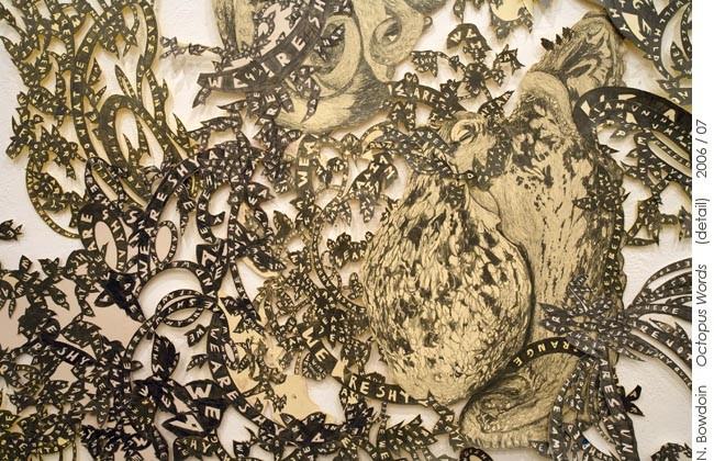Bowdoin costruisce i suoi collages e le sue grandi figure con ritagli di disegni, scritte e carte da gioco. Un ossessivo lavoro di apparenze in transito: alberi con occhi (forse); ragazze come montagne o montagne come ragazze; un bufalo che si muove come il mare (ma forse il mare è un bufalo).