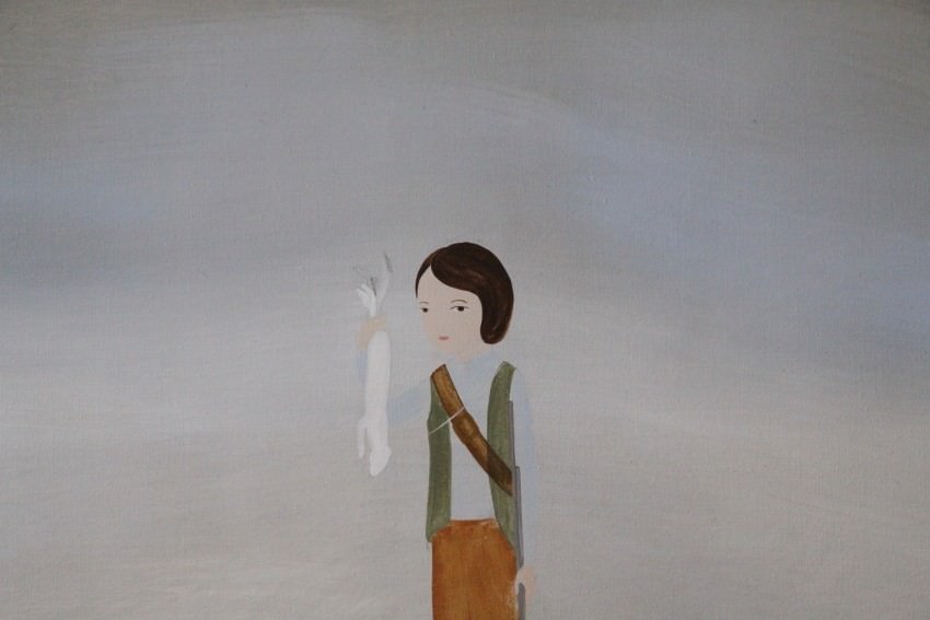 Sia nell’immediatezza del piccolo disegno, sia nello spazio più ampio di alcune tele, ciò che colpisce in queste opere è soprattutto la lontananza in cui sembrano abitare i personaggi di Antich, il loro strano ritiro. Bambini riservati, sfuggenti, che l’artista riesce a distillare con precisione, ma senza enfasi. Colpisce il loro assoluto silenzio, la loro intima concentrazione. Anche a scuola –una delle opera ritrae un gruppo di bambini schierati davanti a un mappamondo– gli sguardi sono di fine circospezione. In un’altra opera, una piccola cacciatrice ci mostra la sua preda, un ermellino (la punta della coda è nera, è inverno). Il viso è distante, quasi inespressivo: nella sua nitidezza la figura sembra lontana da ogni luogo riconoscibile. Non sappiamo se è un gioco o un’illusione.