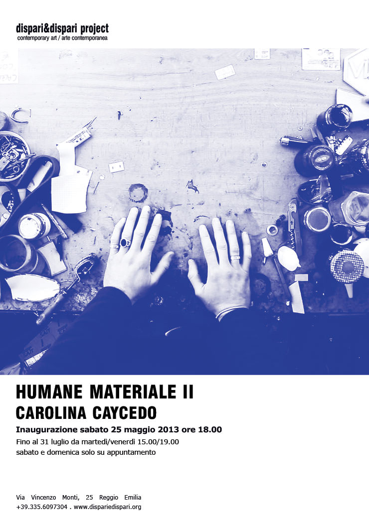 dispari&dispari project inaugura Sabato 25 maggio 2013 alle ore 18.00 Humane Materiale II, una mostra personale di Carolina Caycedo (Londra, 1978). In tale occasione saranno presentata i risultati di una ricerca sui mestieri manuali realizzata nel mese di marzo nella provincia di Reggio Emilia. Questà è la seconda indagine di un progetto artistico iniziato nel novembre del 2012 in Norvegia e presentato nello stesso anno presso il Hordaland Art Centre a Bergen. Lo spazio espositivo sarà caratterizzato dalla presenza di una grande video installazione a 8 canali, un ritratto di artigiani nella contemporaneità. La mostra è aperta al pubblico fino al 31 luglio 2013, per maggiori informazioni per favore visita www.dispariedispari.org