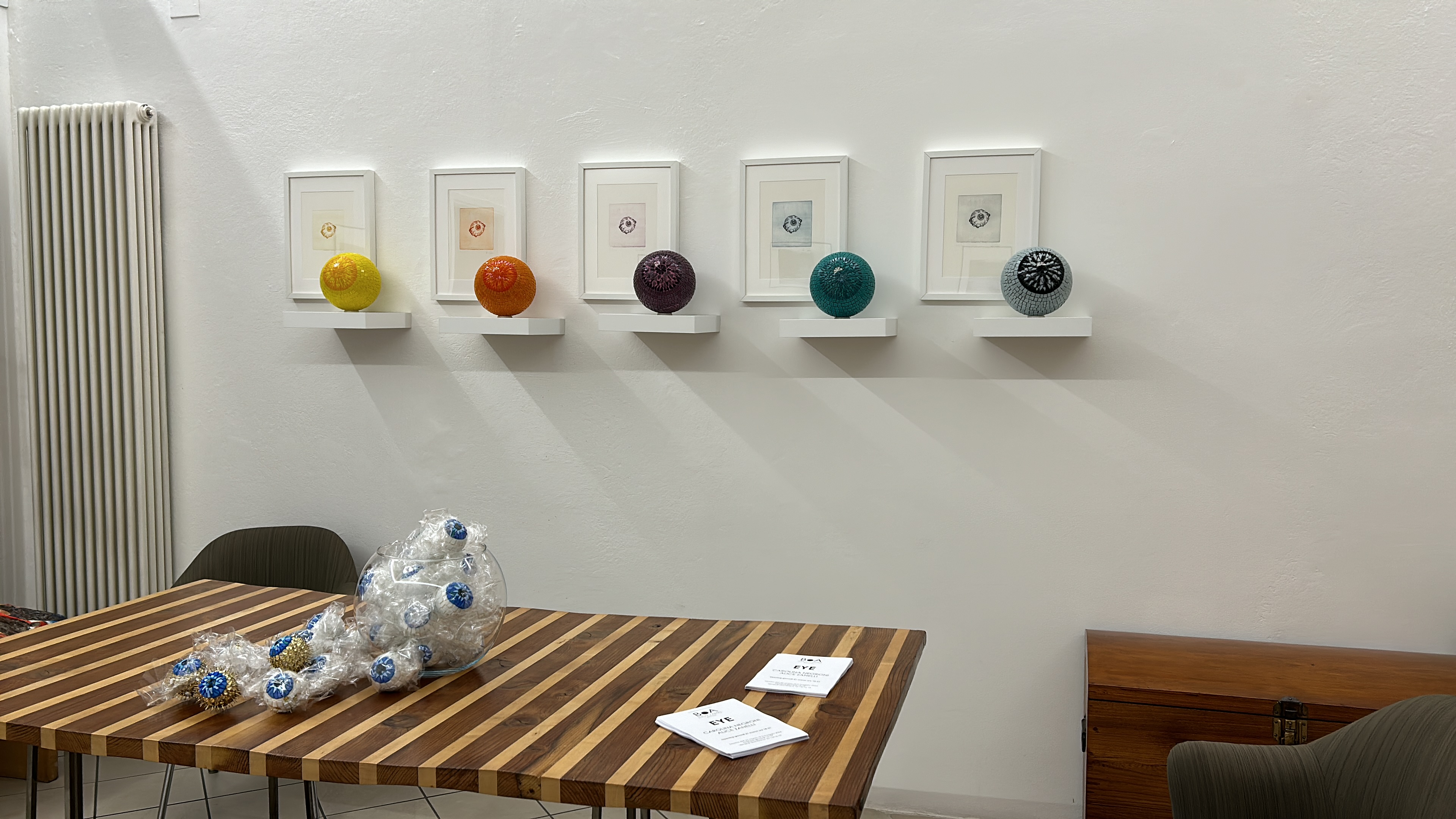 Alice Zanelli, fa dello sguardo nel senso più letterale del termine, il suo soggetto principe, rappresentando attraverso i suoi occhi la variabilità delle sensazioni e la frammentarietà della realtà. Vetri, puntine, schegge di ceramica, riflettono colori cangianti e preziosi e allo stesso tempo rappresentano un potenziale pericolo per l’artista che li ha maneggiati.