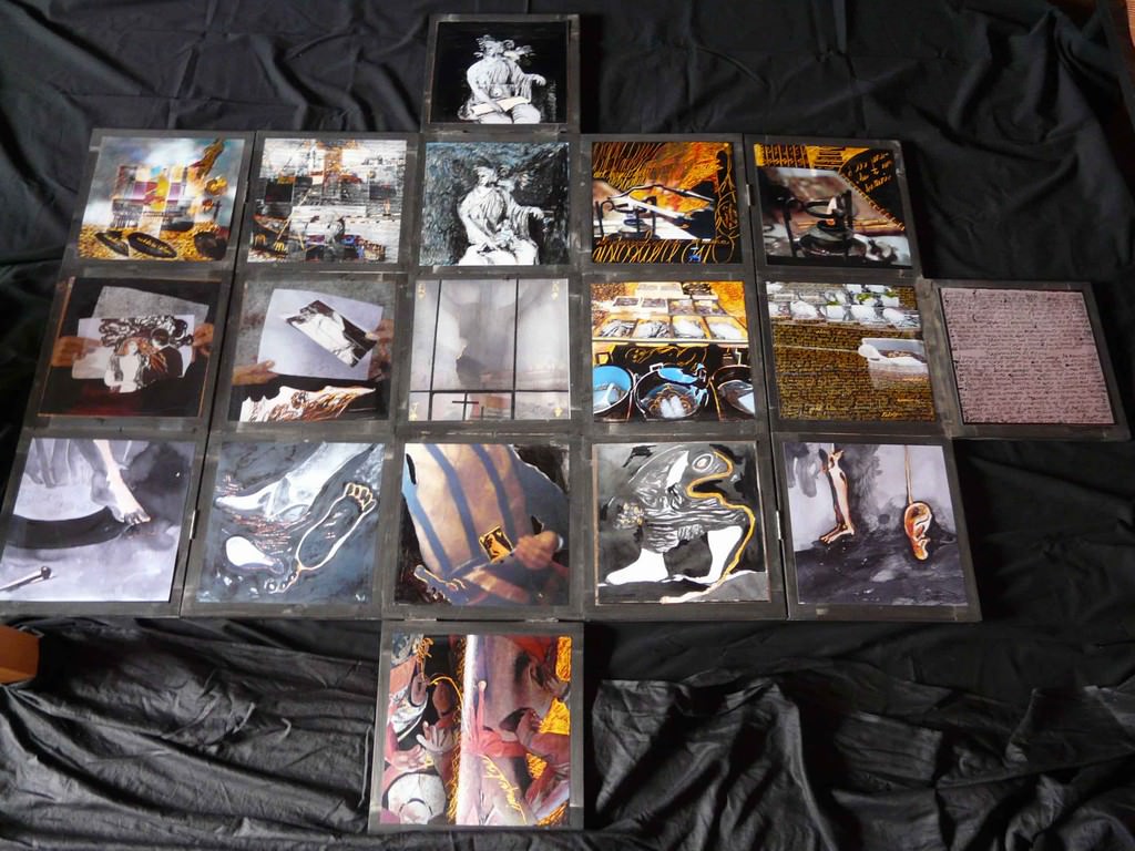 Questi frammenti in trasparenze,in superposizioni sono stati ripresi con disegni e attraversati dalle parole. Tre forme si sono imposte : un teatro di trasparenze, una finestra oscurata da persiane assimetriche e un pentagramma fiorito. Caroline Peyron
