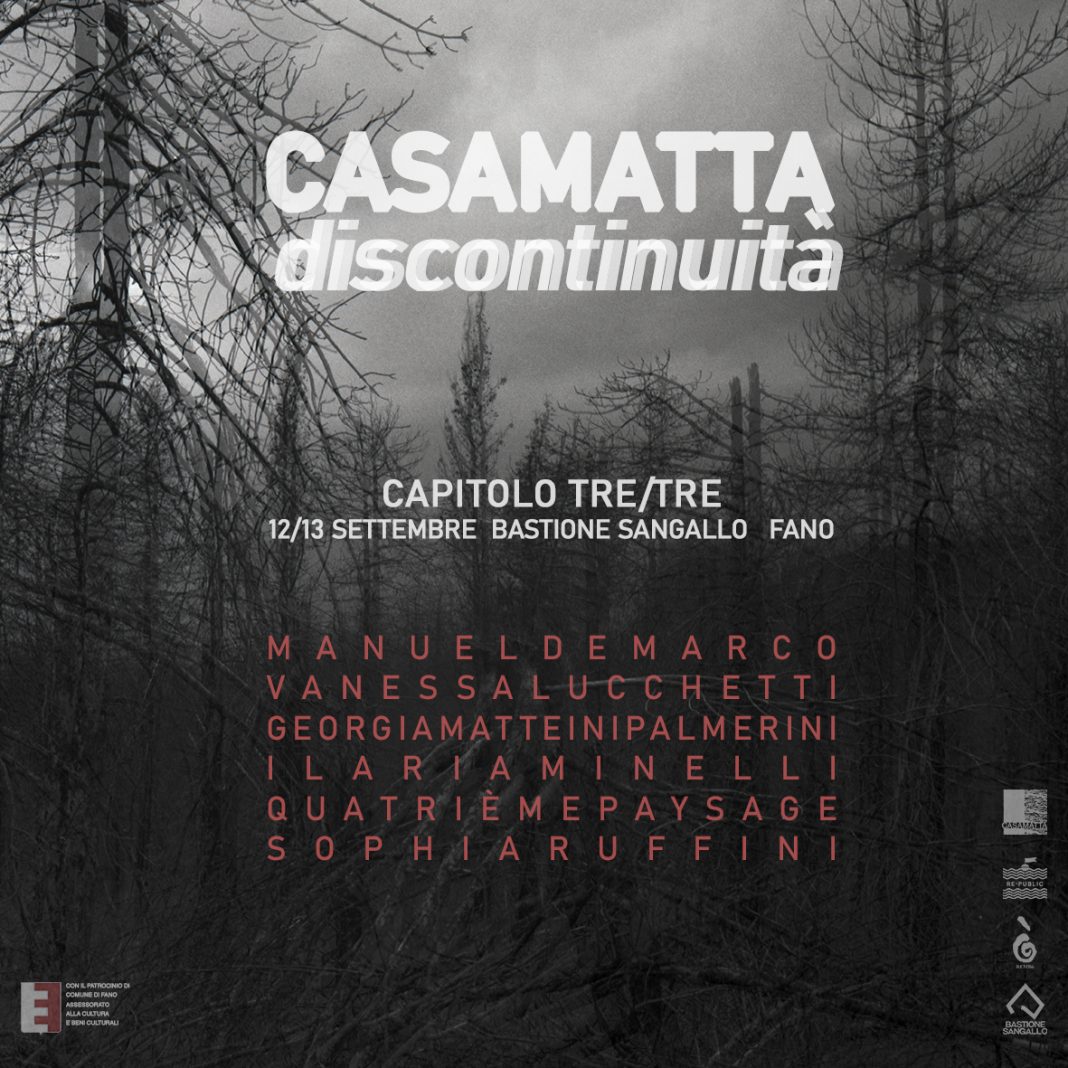 La rassegna CASAMATTA, giunta alla sesta edizione, per il 2020 affronta il tema della discontinuità e nasce dalla necessità e volontà di trovare un senso nella vita contemporanea permeata da quotidiani cambiamenti, variazioni nel percepito, mutamenti inconsci, cambi di rotta; oltre 70 artisti da tutta Italia hanno risposto alla chiamata web lanciata dalle associazioni fanesi ed i 16 selezionati andranno ad inserire le proprie opere all’interno del Bastione Sangallo di Fano, in dialogo con i materiali e le forme del cinquecentesco baluardo fanese.