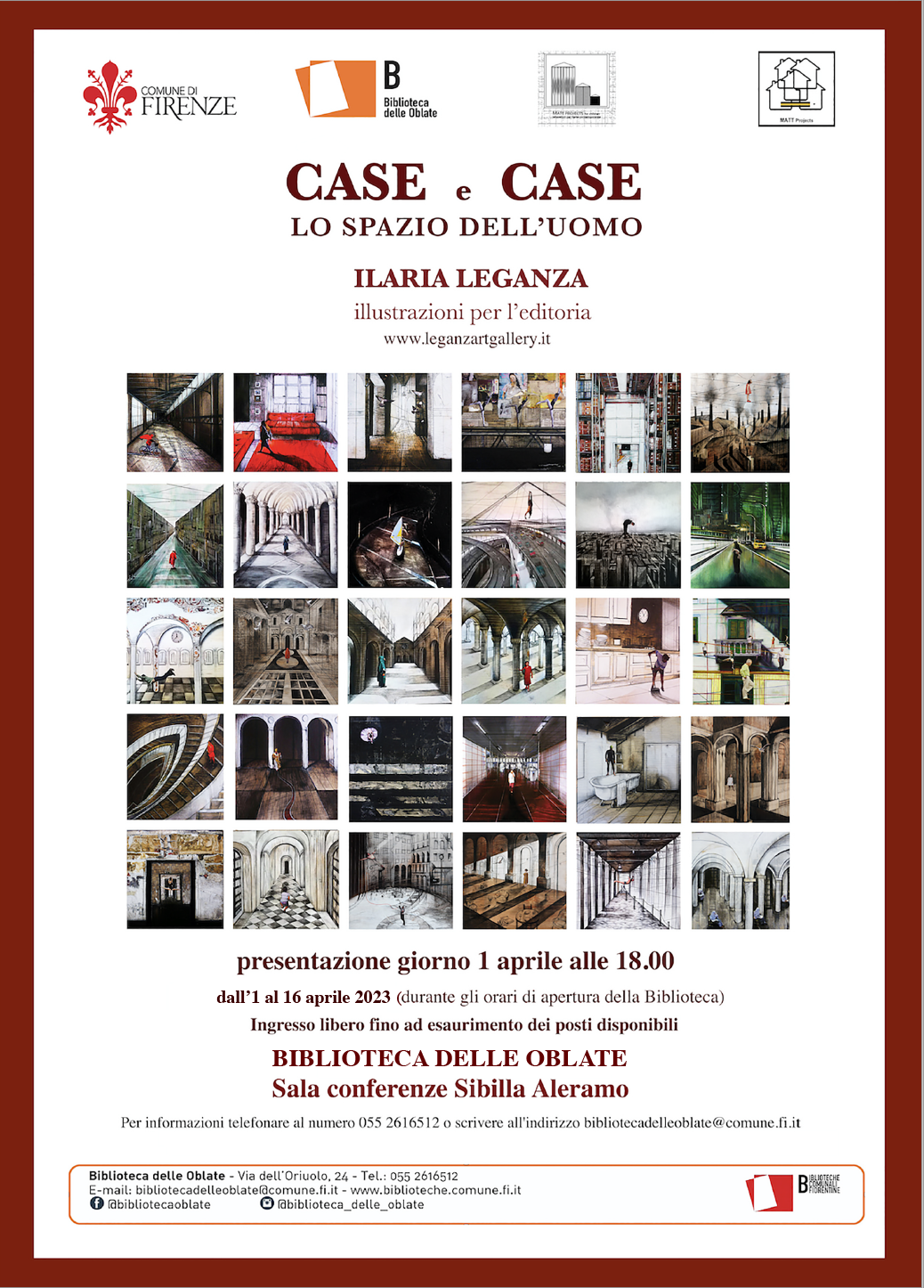Sabato 1 aprile 2023, alle ore 18.00, la sala conferenze Sibilla Aleramo della Biblioteca delle Oblate di Firenze, in via dell’Oriuolo 24, ospiterà l’inaugurazione della mostra di Ilaria Leganza “Case e case”. Un punto di vista sulla realtà contemporanea e sul rapporto tra l’uomo e l’architettura.