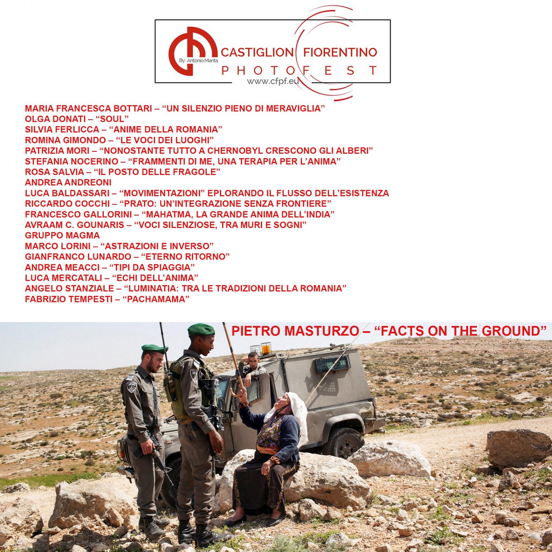 Terza edizione del Castiglion Fiorentino Photo Fest mostra curata, stampata e diretta da Antonio Manta. Venti autori in mostra con diversi progetti e stili, tra di loro anche Pietro Masturzo che ha ricevuto diversi riconoscimenti, tra cui il prestigioso World Press Photo of the Year nel 2010.