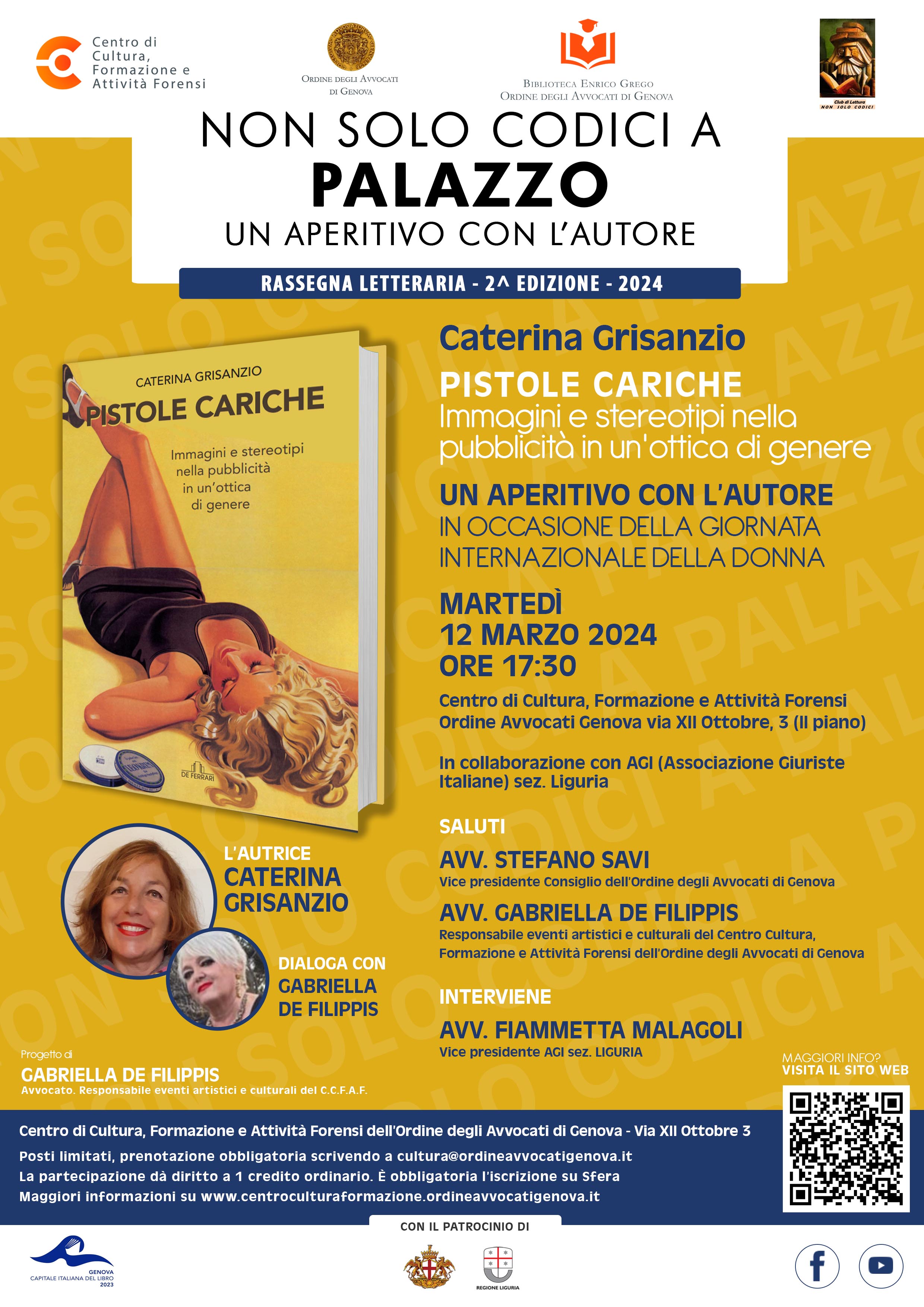Il 12 marzo 2024, alle ore 17,30, nei locali del Centro Cultura Formazione e Attività forensi dell’Ordine degli Avvocati di Genova, in via XII ottobre 3, in occasione dell’8 marzo, giornata internazionale della donna, si terrà il quarto incontro della seconda edizione della Rassegna letteraria dal titolo Non solo Codici a Palazzo - Un aperitivo con l’autore, incontri che si tengono, indicativamente, una volta al mese, alla presenza di uno scrittore.