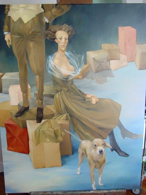Così, nel lavoro della Gran, la figura è predominante, gli sfondi d’oro si traducono in raggi luminosi che attraversano la tavola senza però influire in modo astratto sulla composizione del quadro. La tela si popola di scatole, cani, poltrone, vasche da bagno e bonhommes nonchalants.