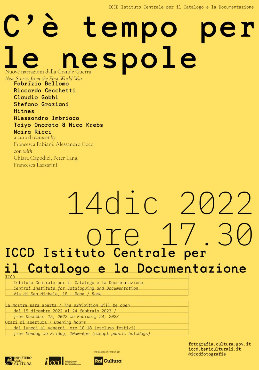 La mostra fotografica C’è tempo per le nespole. Nuove narrazioni dalla Grande Guerra allestita a Roma dal 15 dicembre 2022 al 24 febbraio 2023 negli spazi espositivi ICCD, presenta i risultati di un progetto di ricerca e di committenza sui temi della memoria e della Grande Guerra.