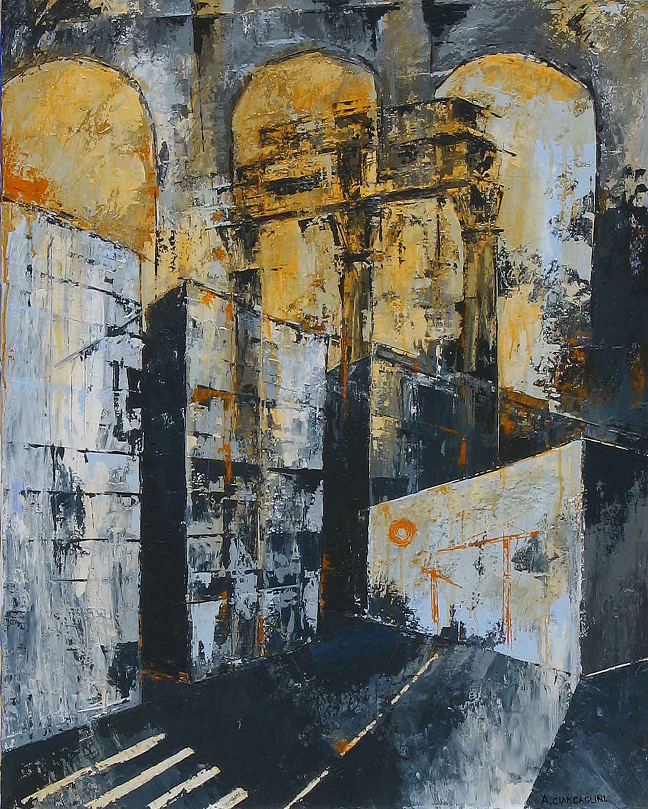 Ruvidi, materici e al tempo stesso elegantemente scanditi dalla griglia geometrica degli spazi, i lavori di Angelo Ciancaglini indagano la città nelle ore in cui l’uomo è assente. Le sue ambientazioni sono albe livide o tramonti infuocati di pm10 e polveri sottili, o magari notti senza luna, dove resta solo una pennellata chiara a regalare un’illusione di luce, mentre tutto il resto si perde in una penombra senza punti di riferimento. Dell’uomo resta traccia nelle stazioni, nei cantieri, nei pilastri di cemento, nelle ombre degli aerei o nei boulevard che si spalancano tra quinte di palazzi squadrati, crivellati da finestre cieche. A volte alla pittura, stesa a spatolate grumose – ostili, verrebbe da dire – si sovrappongono lettere, strisce, solidi geometrici che si librano incongruenti nel cielo. Inquietanti presenze, proprio come il carro armato che appare a un tratto, lasciando il dubbio di trovarci davanti a uno scenario di guerra. Un day after senza speranza.