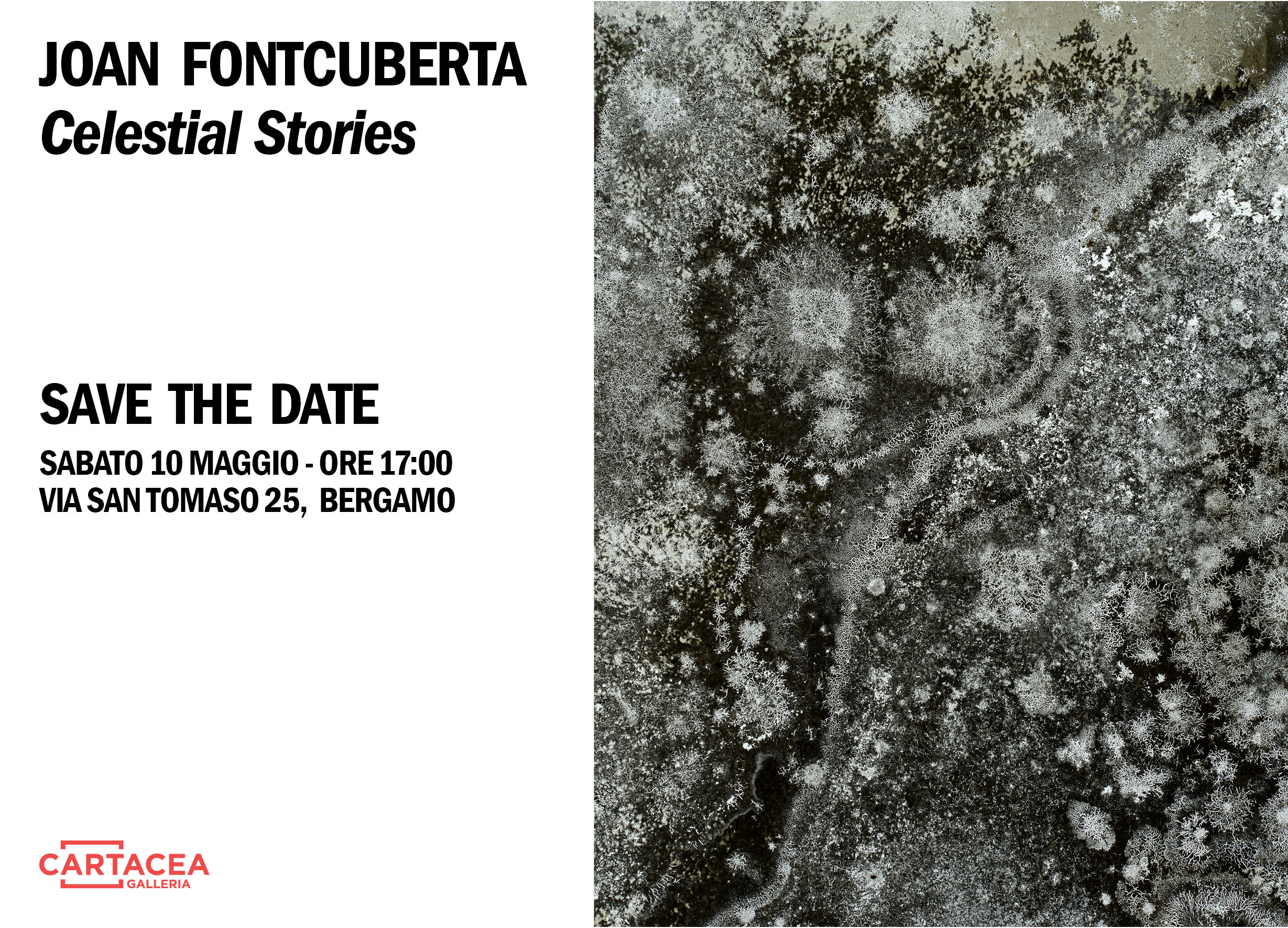 Cartacea Galleria e' lieta di annunciare Celestial Stories, una mostra dedicata a Joan Fontcuberta, artista e teorico di riferimento nell' ambito della fotografia concettuale, riconosciuto internazionalmente come uno dei più importanti esponenti della fotografia contemporanea. Con le sue opere Fontcuberta riesce a creare un universo visivo in cui i concetti di verità e finzione sono strettamente intrecciati esaminando il potere persuasivo dell'immagine e la sua veridicita'. L'esposizione comprende dieci opere provenienti da un lavoro inedito, "La Via Lattea" assieme al leggendario progetto "Sputnik" grazie al quale il suo lavoro è diventato noto a livello internazionale.Tra le istituzioni più rappresentative dove è stato esposto il suo lavoro troviamo: Folkwang Museum (Essen, 1987), il MoMA (New York, 1989), l’IVAM (Valencia, 1992), il Musée Redpath di Montreal (Canada, 1999), la Fondazione Miró (Palma di Maiorca, 2007), l’Australian Centre of Photography (Sydney, 2007), il Fotografiemuseum (Amsterdam, 2010) e il Fotografins Hus (Stoccolma, 2013), Maison Européene de la Photographie (Parigi 2014). Il suo lavoro fa parte di importanti collezioni: MoMA e The MET (New York), dell’Art Institute of Chicago, Reina Sofía (Madrid), del Centre Pompidou (Parigi) e del MACBA (Barcellona) ecc.