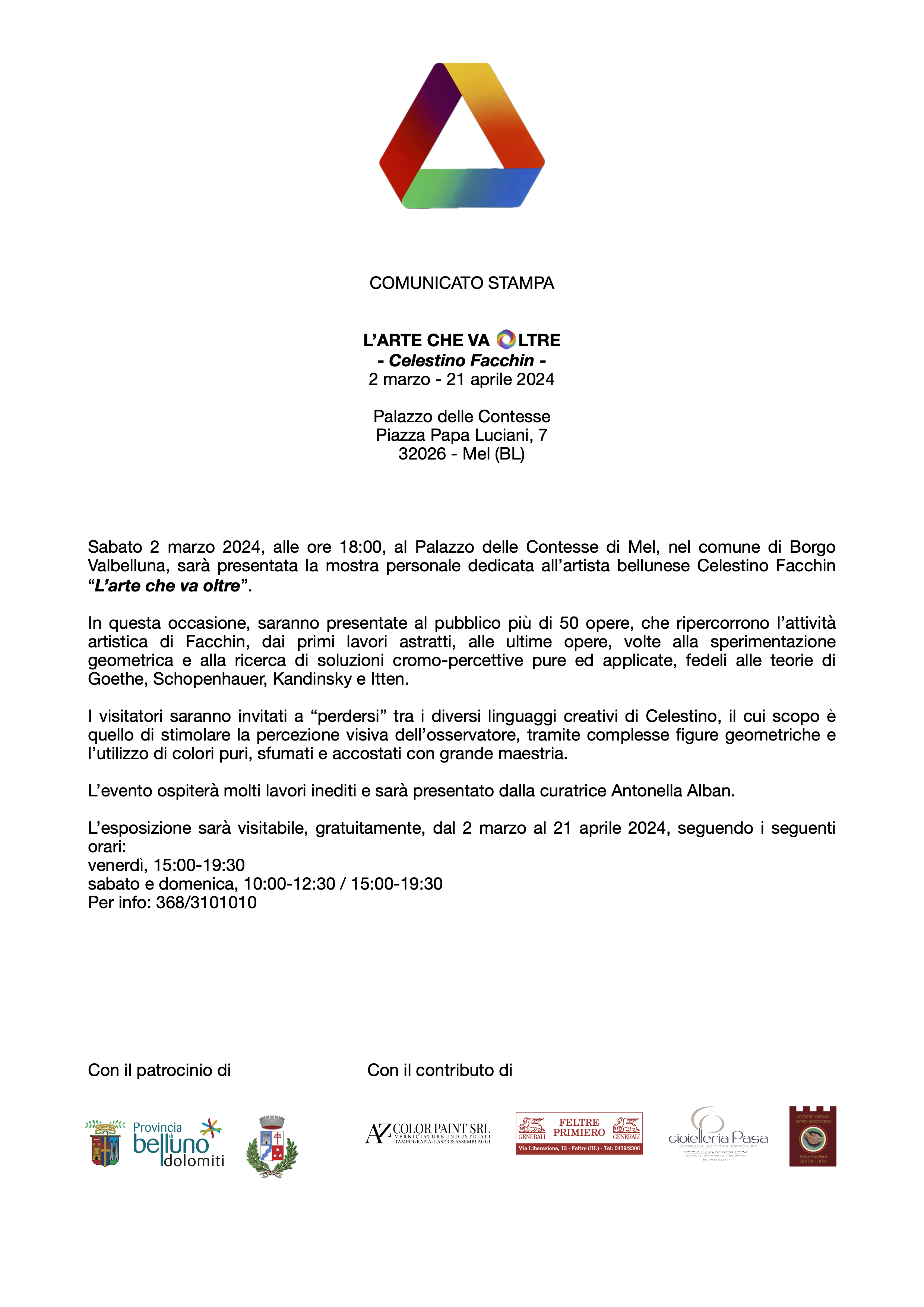 Saranno presentate al pubblico più di 50 opere, che ripercorrono l’attività artistica di Celestino Facchin, dai primi lavori astratti, alle ultime opere, volte alla sperimentazione geometrica e alla ricerca di soluzioni cromo-percettive pure ed applicate.