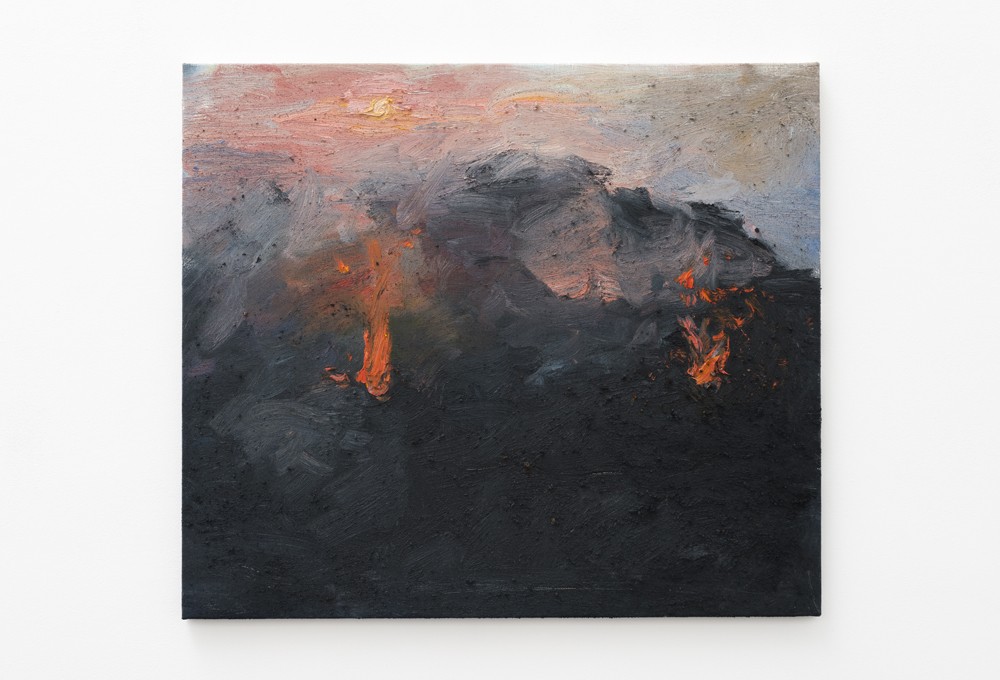“My work relates to an experience of looking, often in situations that are circumscribed. In this exhibition, two divergent experiences are presented, a violent landscape that is physically present in rocks and ash on the surface of the paint, while the other shows secret views of everyday life mediated by the cool silence of digital surveillance.”