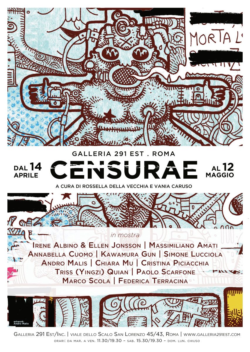 Censurae sarà, infatti, l’eterogeneo sguardo degli artisti Massimiliano Amati, Annabella Cuomo, Simone Lucciola, Andro Malis -la sua fanzine Nextasy 06 è stata rielaborata per la grafica promozionale dell’evento- Cristina Piciacchia, Paolo Scarfone, Marco Scola e Federica Terracina; con la compartecipazione internazionale dell’italo-greca Irene Albino e della svedese Ellen Jonsson, della cinese Triss (Yingzi) Qian, del giapponese Kawamura Gun e la consolidata incursione dei suoi iconici Nudisti Timidi, che da sempre ascrivono il tema della censura al falso pudore comune. Infine, Censurae sarà anche la performance di Chiara Mu, prevista a chiusura del vernissage, che si terrà venerdì 14 aprile 2023 a partire dalle ore 18:30.
