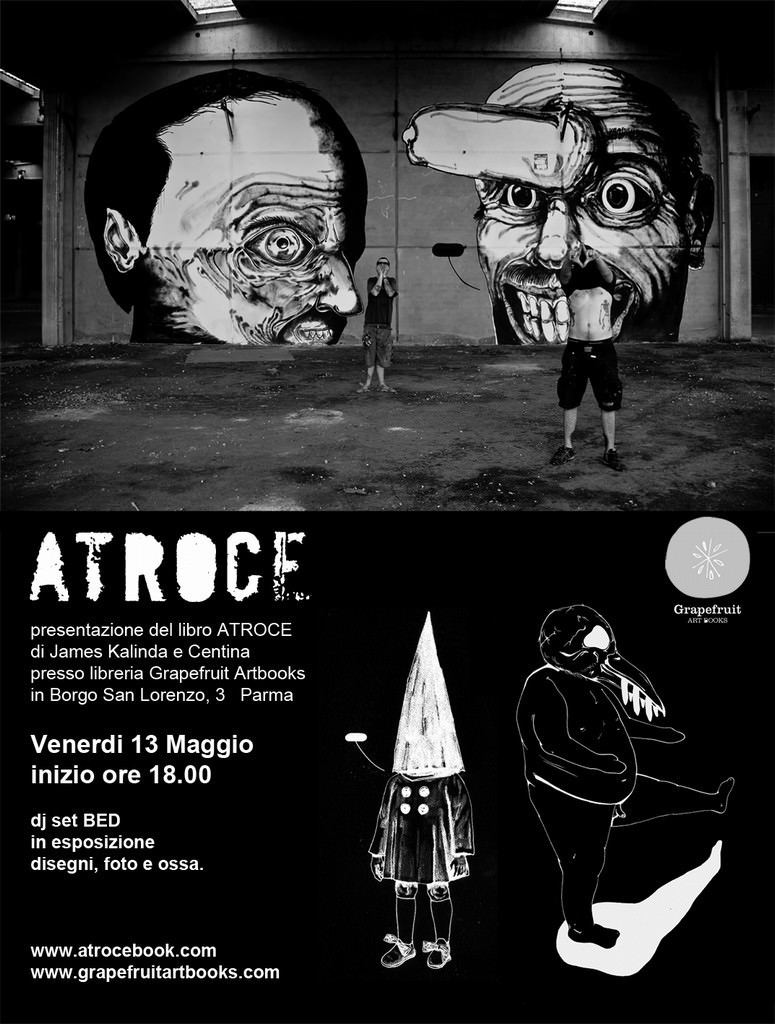 Atroce raccoglie, in parte, il lavoro di circa un anno di due disadattati: James Kalinda e Centina. Con il supporto di tre fotografi, oltre alla documentazione delle opere finite, abbiamo cercato di approfondire anche il contesto e il modus operandi in cui i disegni vengono sviluppati.