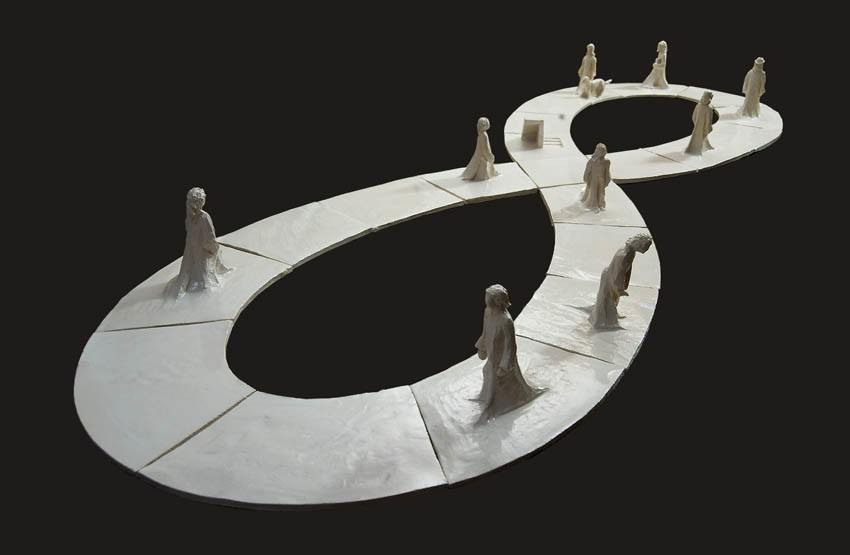 Ognuna a suo modo queste opere si propongono di andare all’aperto, di cogliere ora nei sentieri alti della storia dell’arte ora in una pittura che ricorda, invece, gli ex voto o i carretti decorati per le fiere di paese, una spontaneità senza retrogusti. La natura comincia dentro di noi, ma va cercata e fatta crescere con la memoria: allora essa si salda al nostro fare, e questo a quello d’altri, come avveniva quando erano le comunità, e non solo le fortune dei singoli (comunque effimere), a costruire i paesi. Per questo l’installazione di Giulio Perfetti, ove pensosi individui in cammino percorrono il simbolo dell’infinito, ci fa avvertire qualcosa di profondo, portato a contatto con la nostra realtà; mentre l’aquilone di Donatella Fogante sembra indicare una via di ricerca che fissa, su una delle porte carraie d’Appignano, l’impulso a uscire «pei viottoli dei campi» unendo l’opera umana alla natura secondo traiettorie a venire, ma già visibili: «C’è qualcosa di nuovo oggi nel sole, / anzi d’antico: io vivo altrove, e sento / che sono intorno nate le viole».