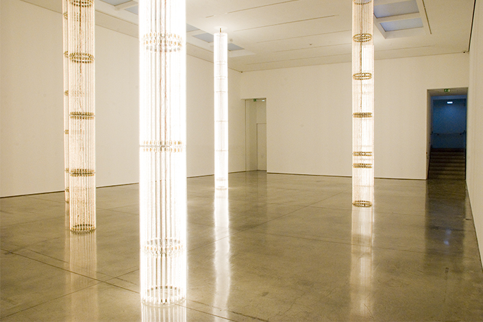 La mostra “ ....the Illuminating Gas”, a cura di Roberta Tenconi e Vicente Todolí, presenta venticinque lavori, tra sculture storiche, complesse installazioni monumentali e nuove produzioni, che occupano in tutto il suo volume gli oltre cinquemila metri quadrati delle Navate e del Cubo di Pirelli HangarBicocca. Il percorso si apre con il lento e costante pulsare di sette imponenti colonne luminose alte venti metri StarStarStar/Steer (totransversephoton) (2019). L’opera, realizzata appositamente per la mostra e composta da uno scheletro di lampade tubolari assemblate in cilindri di varie altezze, crea una coreografia di luci e ombre che a intermittenza invadono lo spazio. Tale dispiego di energia fa da contrappunto al suono emesso dall’opera attigua, eterea scultura in vetro anch’essa composta di elementi trasparenti, Composition for 37 flutes (2018). Dalle sue sottili canne l’aria scaturisce in un sibilo che suggerisce uno stato di tensione tra l’armonia di un respiro e il suo dissolversi.