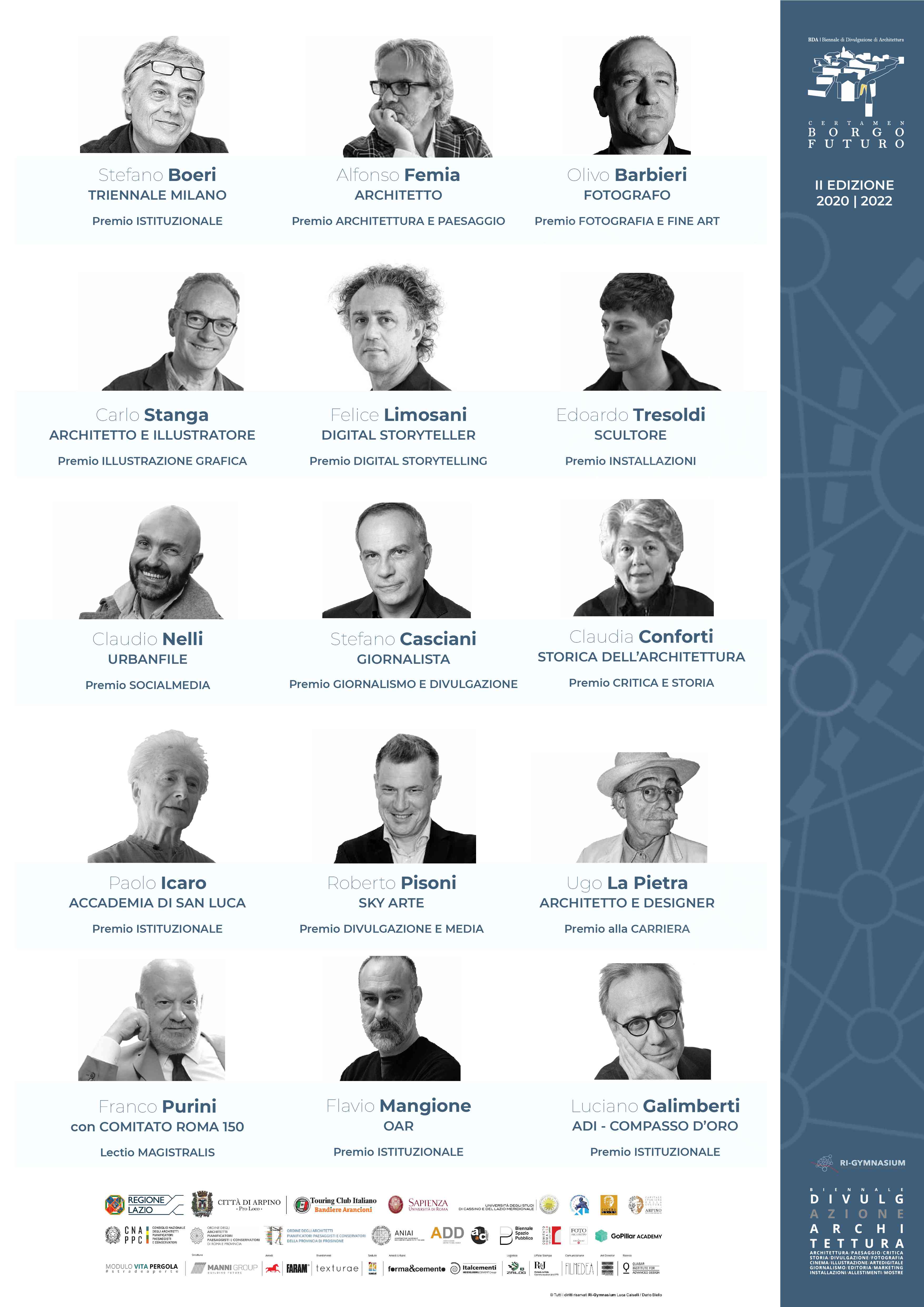 I premiati della BDA Borgo Futuro saranno coinvolti attivamente, con la produzione di masterclass video a loro dedicate, accessibili gratuitamente on line. Oltre 10 ore di interviste e contenuti grafici, animeranno una piattaforma che al suo interno potrà contare sui contributi di: Stefano Boeri | Triennale Milano, Alfonso Femia | Architetto, Olivo Barbieri | Fotografo, Carlo Stanga | Illustratore, Felice Limosani | Digital Storyteller, Edoardo Tresoldi | Scultore, Claudio Nelli | Urban File, Stefano Casciani | Giornalista, Claudia Conforti | Storica dell’Architettura, Francesco Moschini | Accademia di San Luca, Roberto Pisoni | Sky Arte, Ugo La Pietra | Architetto e Designer, Flavio Mangione | Ordine Architetti Roma, Luciano Galimberti | ADI Compasso d’Oro.