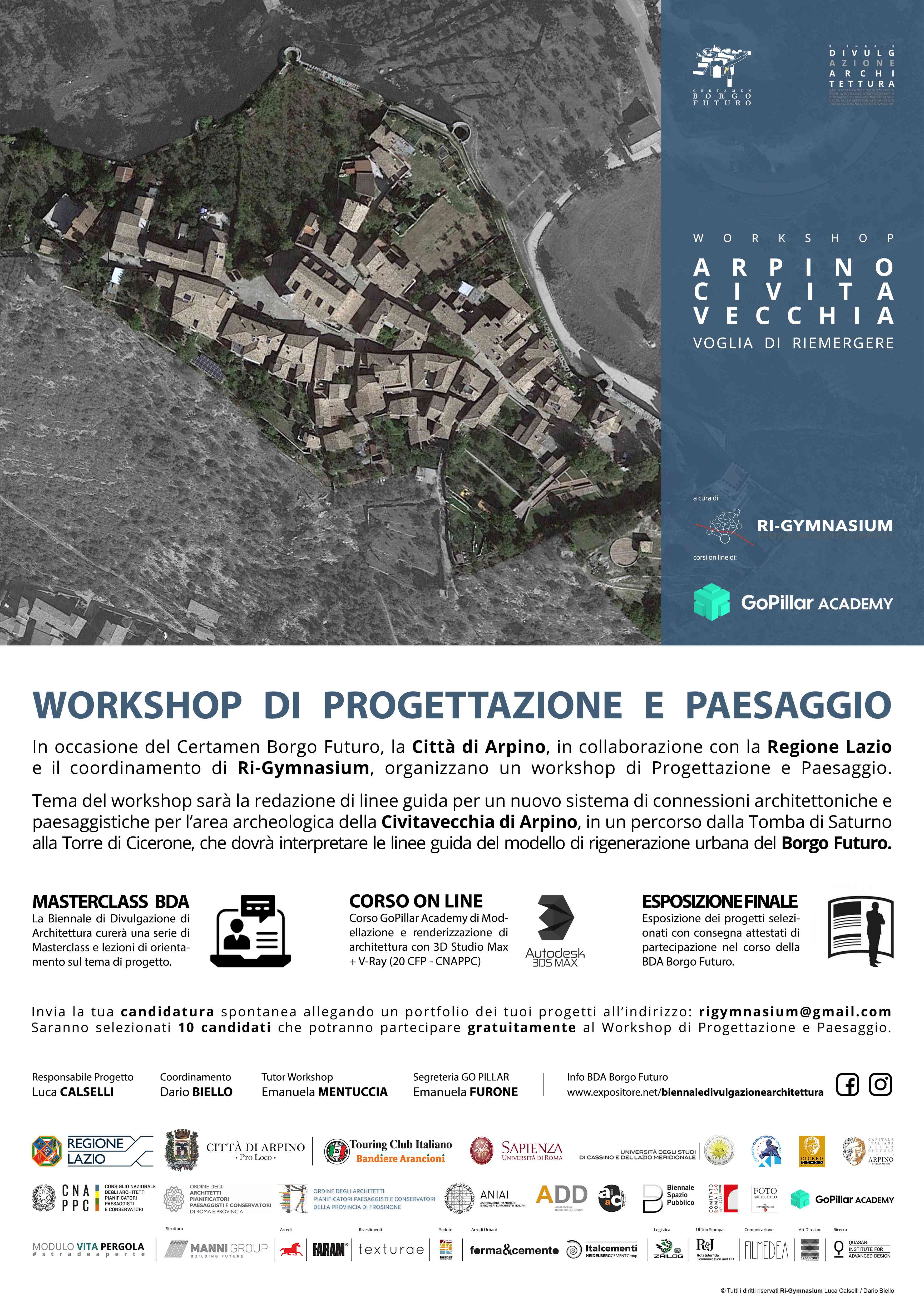 Con la collaborazione della GoPillar Academy di San Francisco, in occasione del Certamen Borgo Futuro saranno realizzati due Workshop internazionali. Il primo sulla Progettazione e il Paesaggio, rivolto ad architetti (20 Cfp – CNAPPC), chiamati a ripensare un nuovo sistema di connessione funzionale nell’area archeologica della Civitavecchia di Arpino.