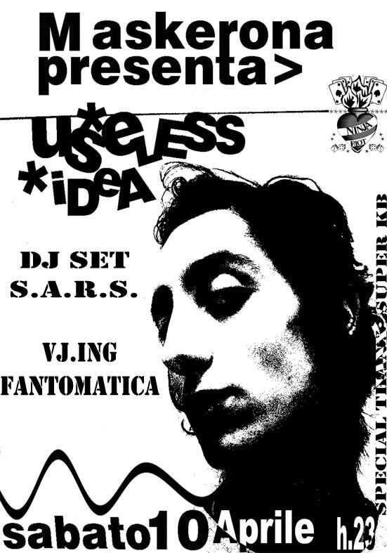 Sabato 10 Aprile presso il circolo A.R.C.I. “Mascherona” a partire dalle ore 23.00 si inaugurerà l’esposizione personale con intervento e attivazione degli spazi di Cesare Bignotti a.k.a. Useless*Idea . La serata continuerà con live DJ set di S.A.R.S. (drum n’ bass - elettronica) e VJing della “Fantomatica” fino alle 05.00.